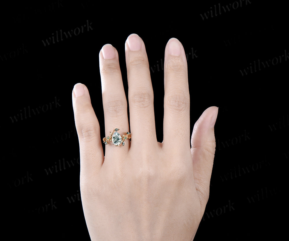 Vintage pear green moss agate engagement ring solid 14k yellow gold nature inspired leaf floral emerald wedding ring women gift