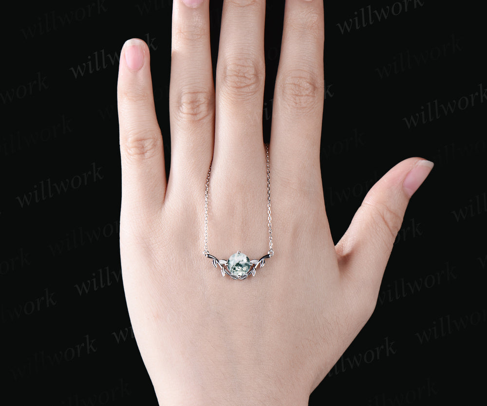 Minimalist Round Cut Natural Green Moss Agate Necklace Leaf Twig Vine Branch Nature Inspired Pendant 14k White Gold Solitaire Promise Jewelry Gift For Women