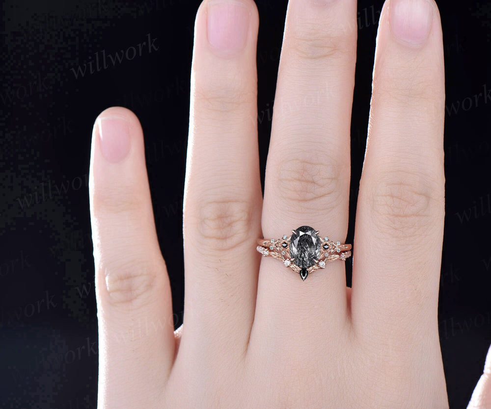 Vintage oval black rutilated quartz engagement ring leaf nature inspired black spinel diamond ring women art deco bridal promise ring set