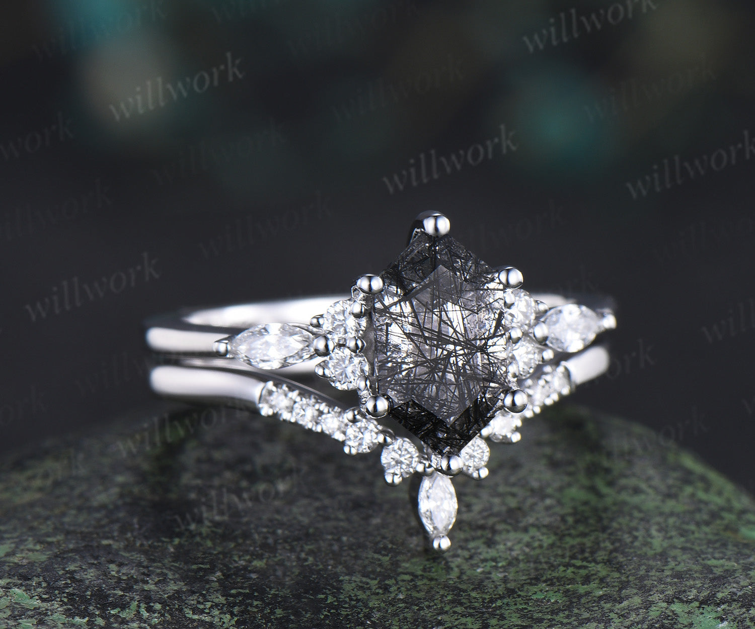 ***A striking elongated hexagon black rutilated quartz radiates mysterious elegance, framed by shimmering marquise and round moissanites. The matching curved wedding band embraces the center stone in harmony, creating a captivating bridal set that embodies strength, balance, and timeless allure.***- Metal: Solid gold(10K/14K/18K white/yellow/rose gold),925 sterling silver,platinum available