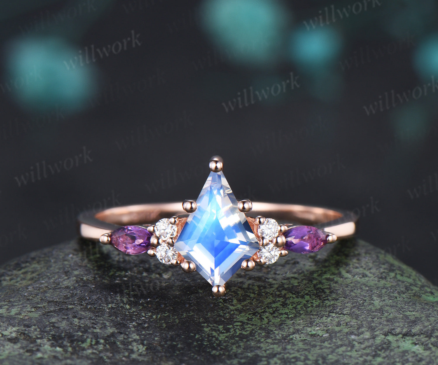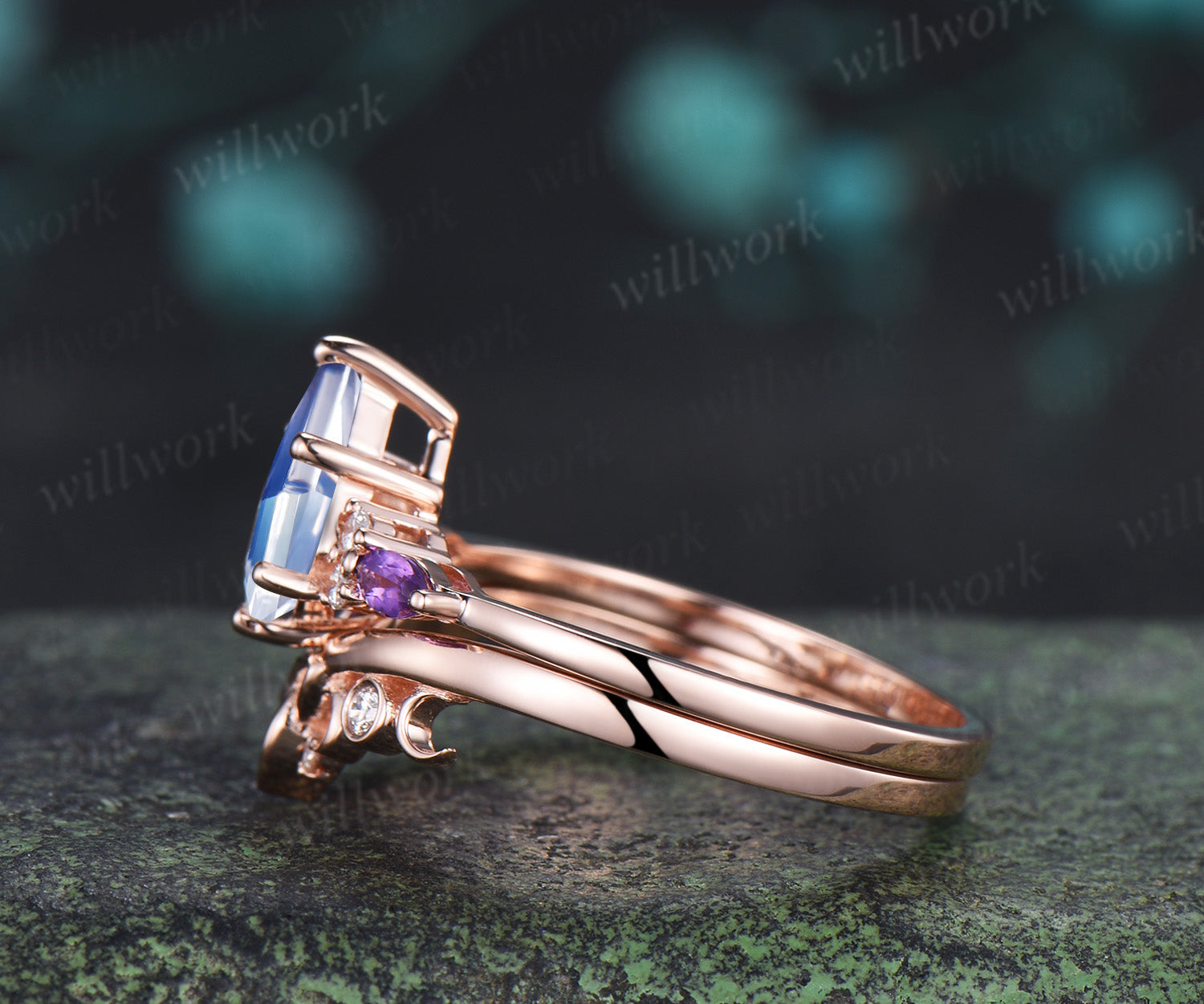 Kite cut natural moonstone ring set marquise amethyst diamonds promise ring celtic knot wedding band vintage bridal set