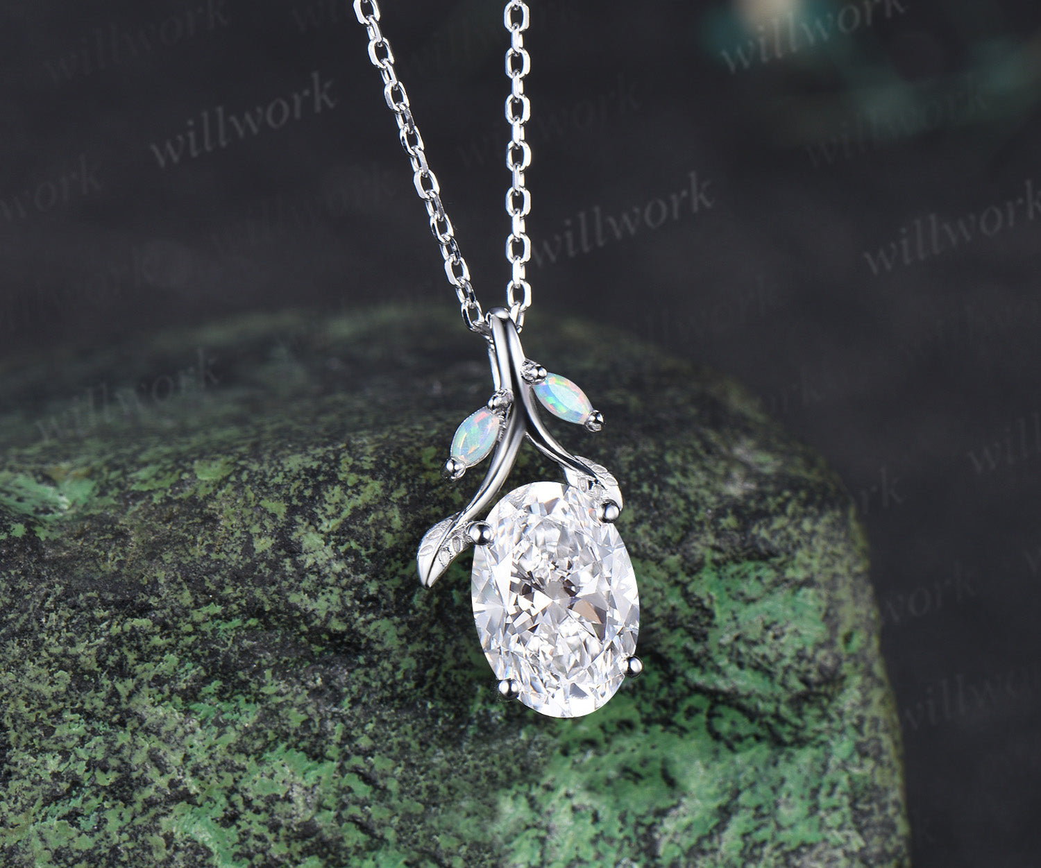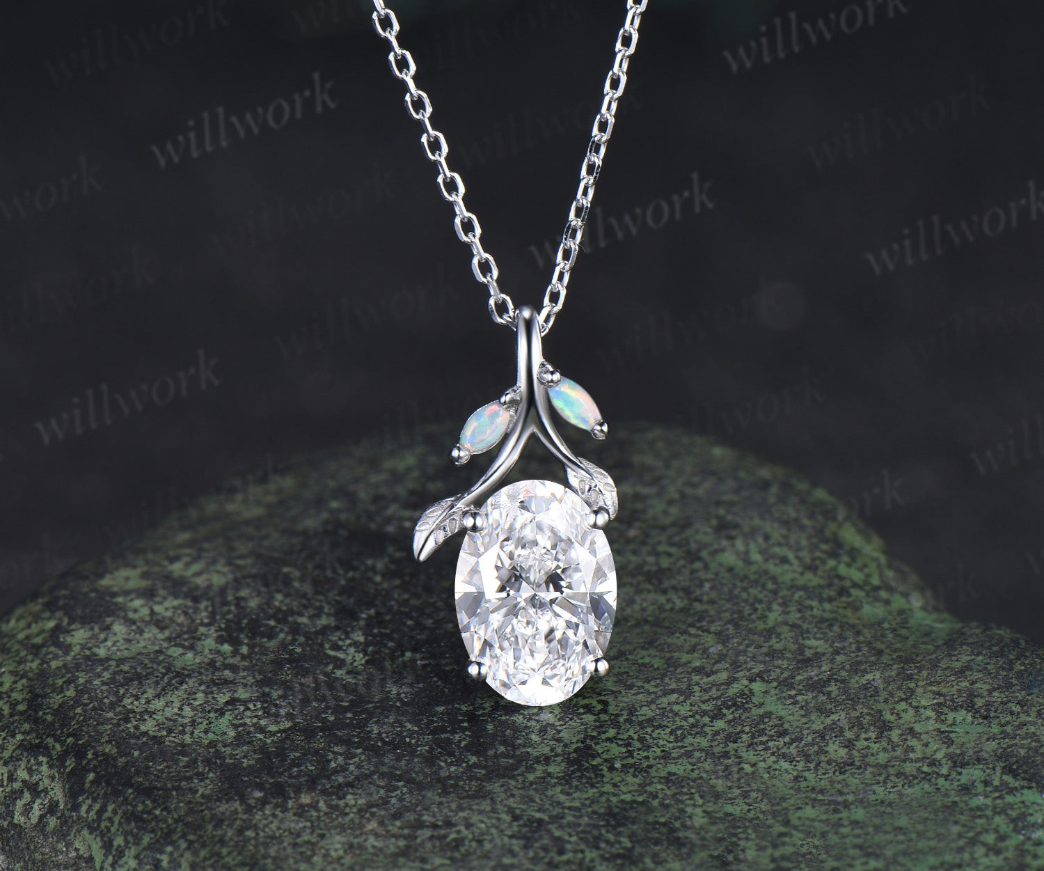Oval Lab grown diamond necklace nature inspired accent opals elegant pendant necklace anniversary gifts
