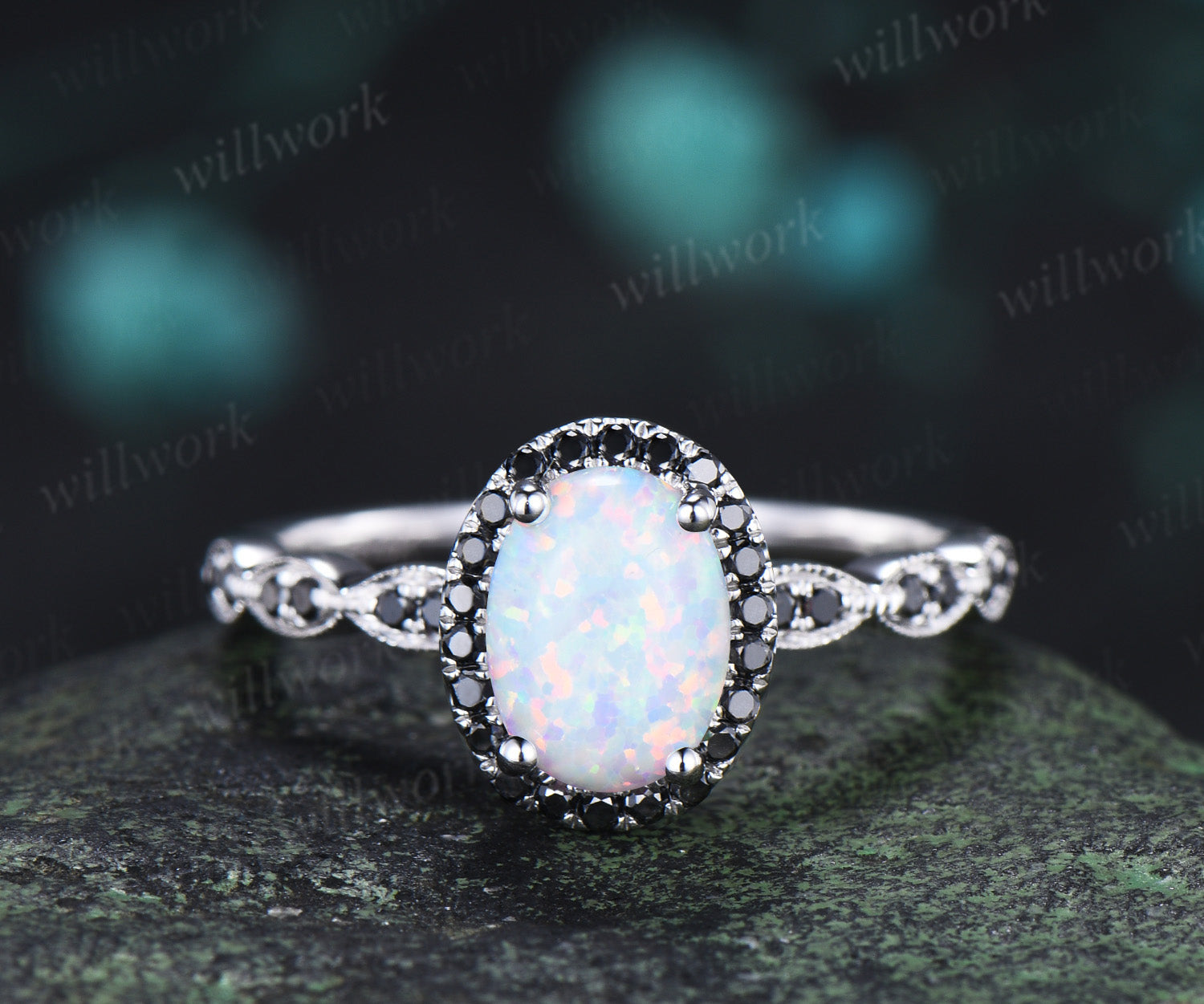 Oval white opal engagement ring vintage black diamond halo half eternity band promise ring