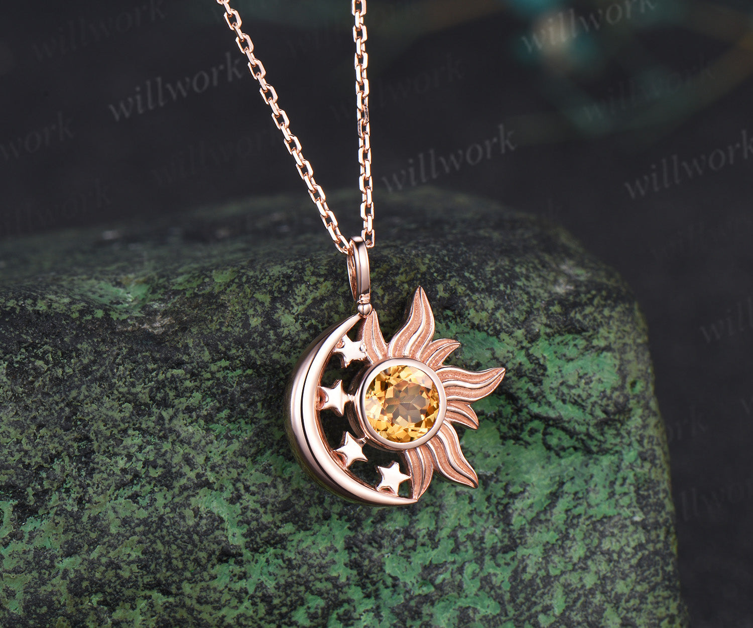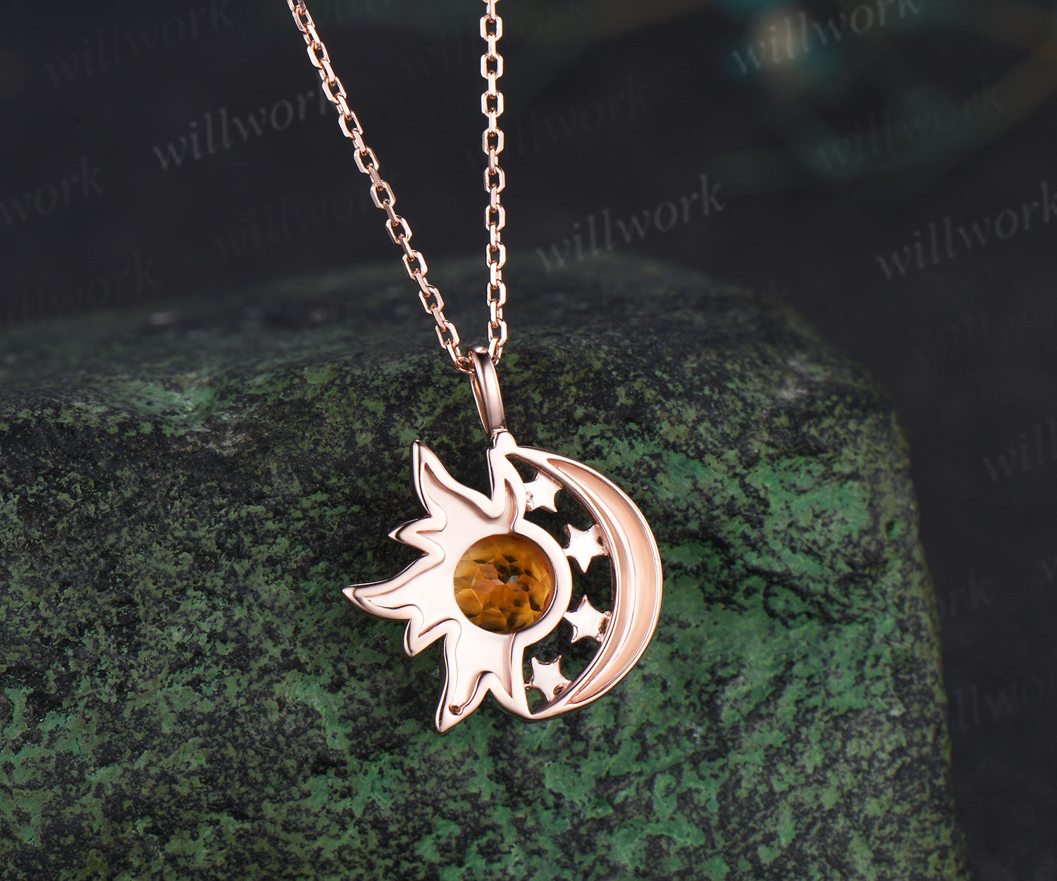 Round citrine sun moon star pendant necklace celestial sun charm with moon stars jewelry gifts