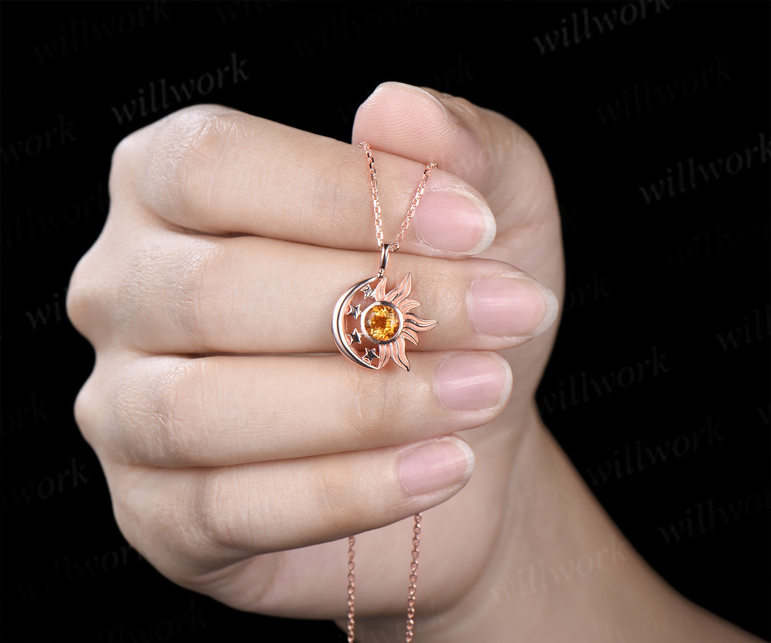 ***A glowing citrine rests at the heart of a rising half-sun, balanced by a crescent moon and scattered stars—a poetic dance of day and night. This sun moon star citrine pendant necklace symbolizes the gentle rhythm of time and the eternity of love, making it a luminous celestial gift for her and a stunning piece for any jewelry collection.***- Metal: Solid gold(9K/14K/18K white/yellow/rose gold),925 sterling silver, platinum available