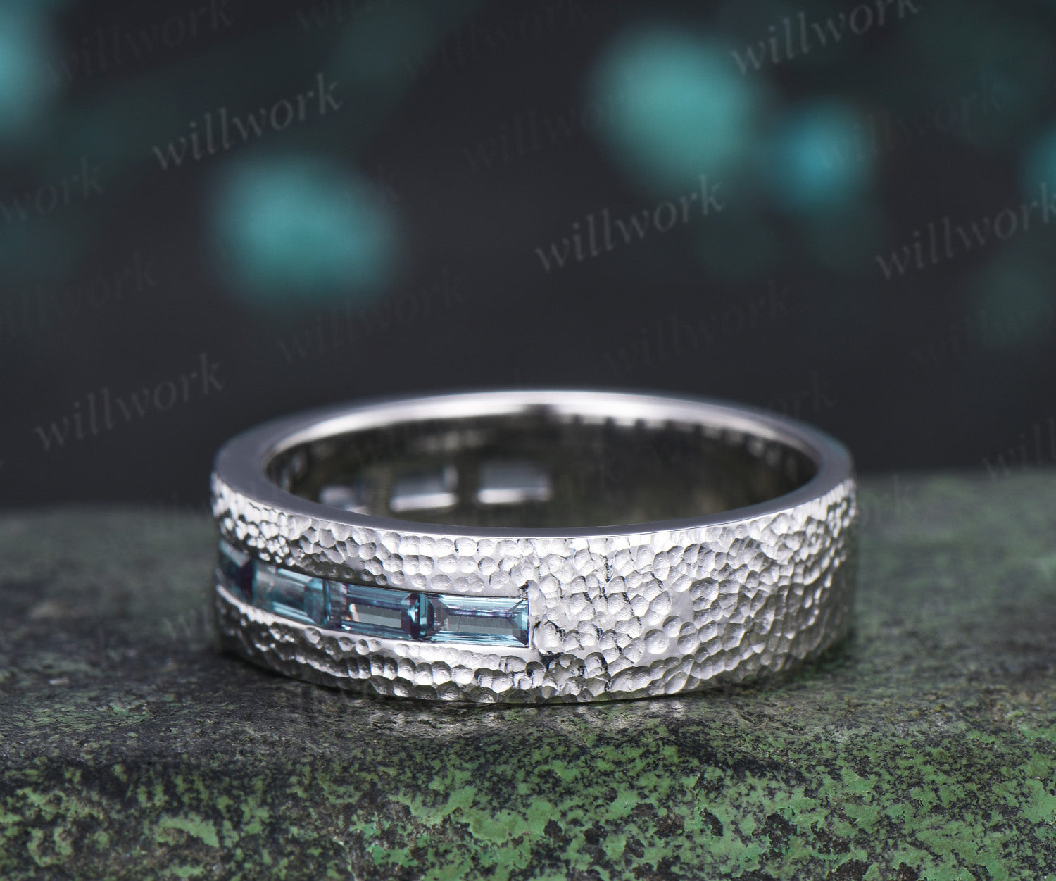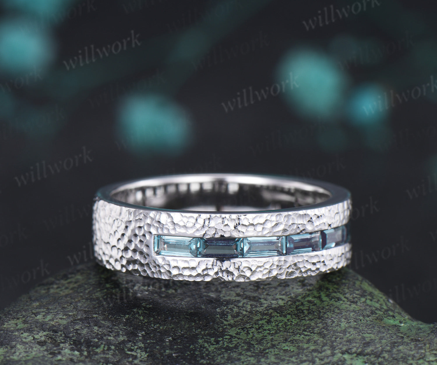 ***Vintage inspired and quietly powerful, this baguette cut alexandrite wedding ring features a refined half eternity design with a handcrafted hammered finish. The color-changing alexandrite adds depth and mystery, creating a timeless men’s promise or anniversary ring that blends strength, romance, and artisanal elegance.***- Metal: Solid gold(10K/14K/18K white/yellow/rose gold),925 sterling silver,platinum available