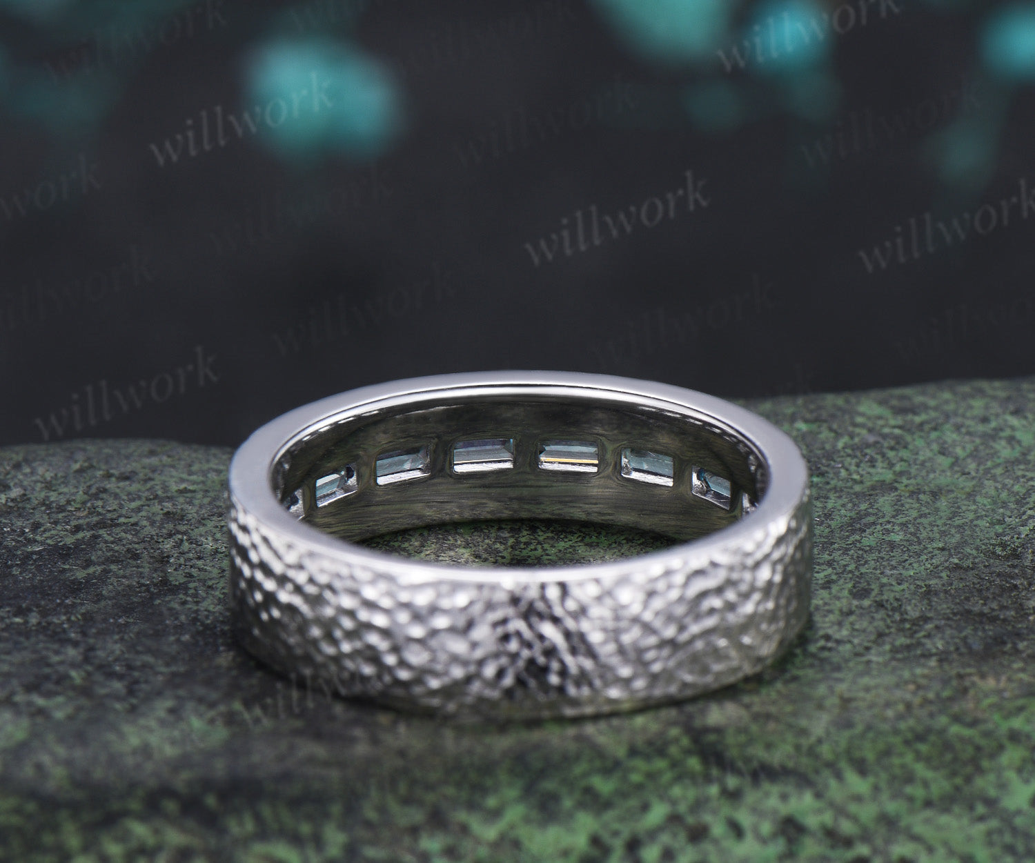 Vintage Baguette cut alexandrite wedding ring half eternity mens hammered promise anniversary ring