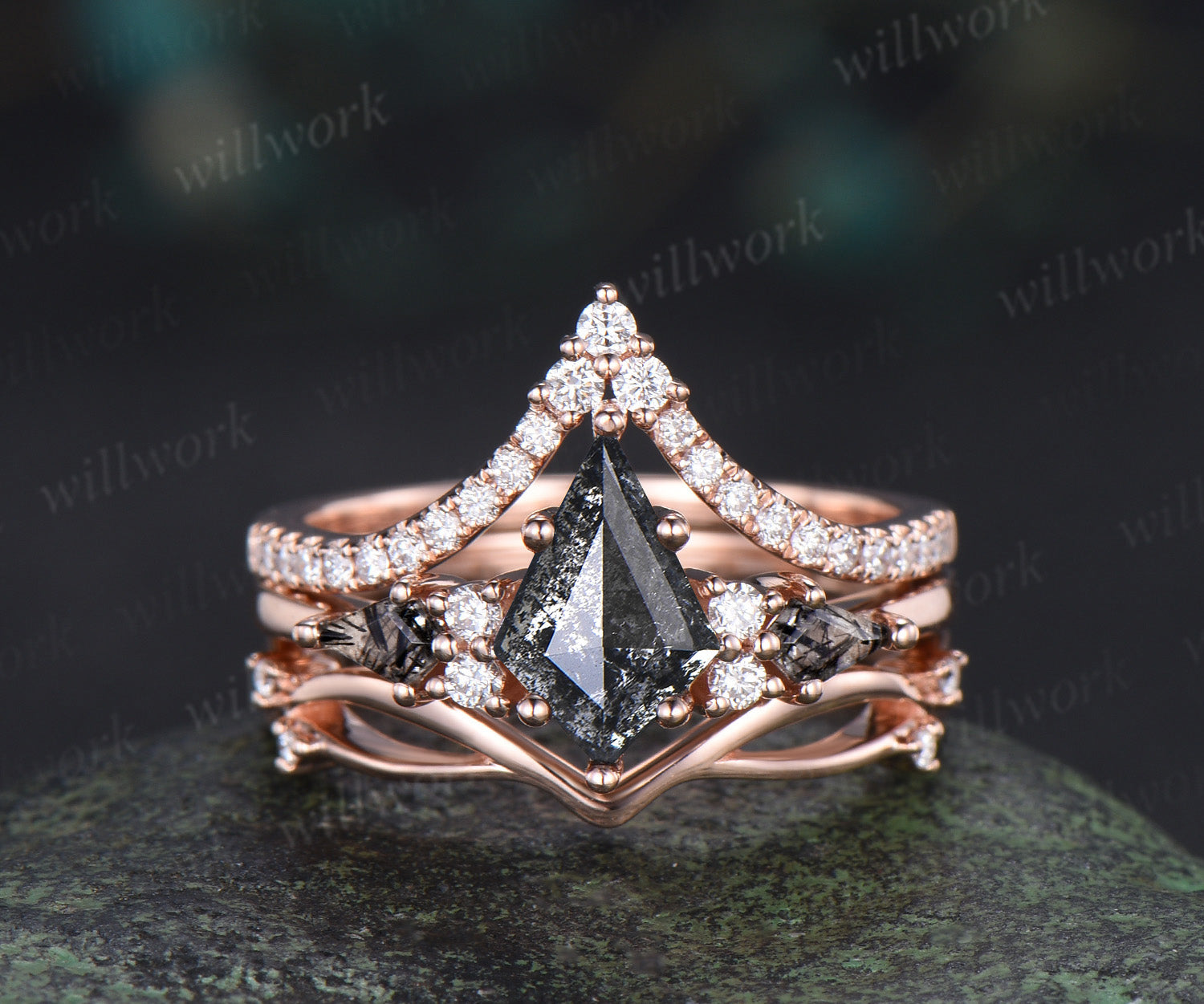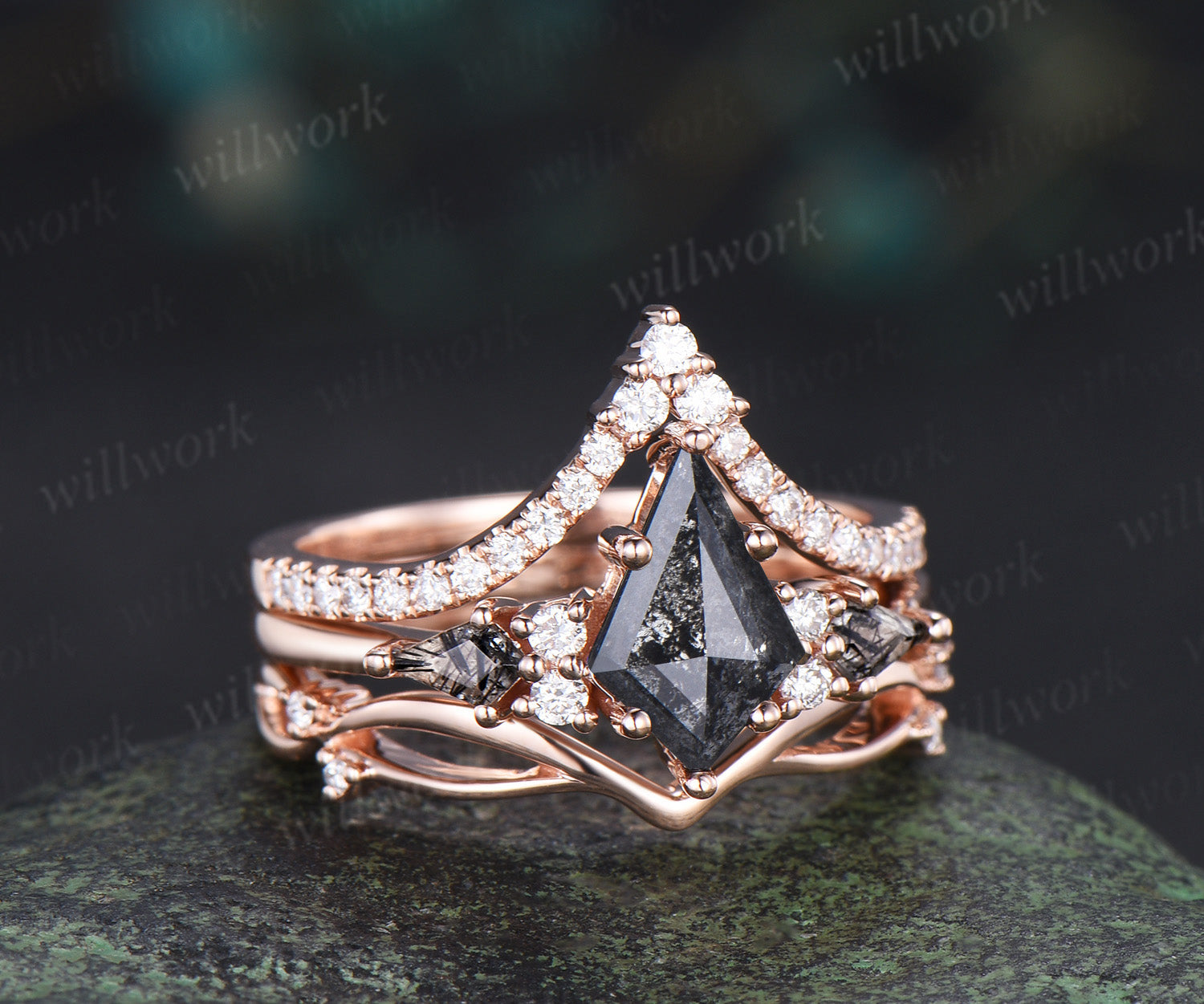Vintage kite cut salt and pepper diamond engagement ring set unique kite black rutilated seven stone diamond bridal set