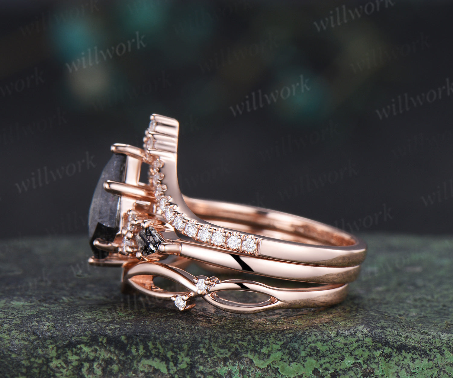 ***This exquisite bridal set features a stunning seven-stone engagement ring, highlighted by a kite cut salt and pepper diamond and shimmering kite black rutilated quartzes. The natural inclusions create a mesmerizing galaxy-like effect, symbolizing uniqueness and depth. Paired with a twisted infinity band and a curved band, this vintage-inspired design embodies harmony, individuality, and timeless elegance.***- Metal: Solid gold(10K/14K/18K white/yellow/rose gold),925 sterling silver,platinum available