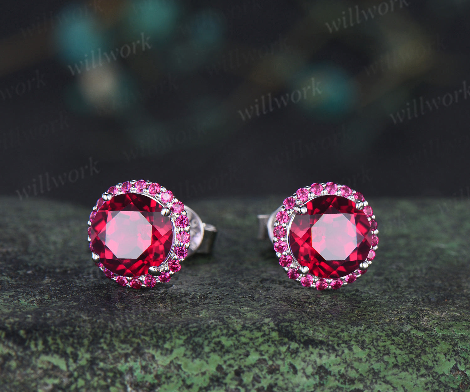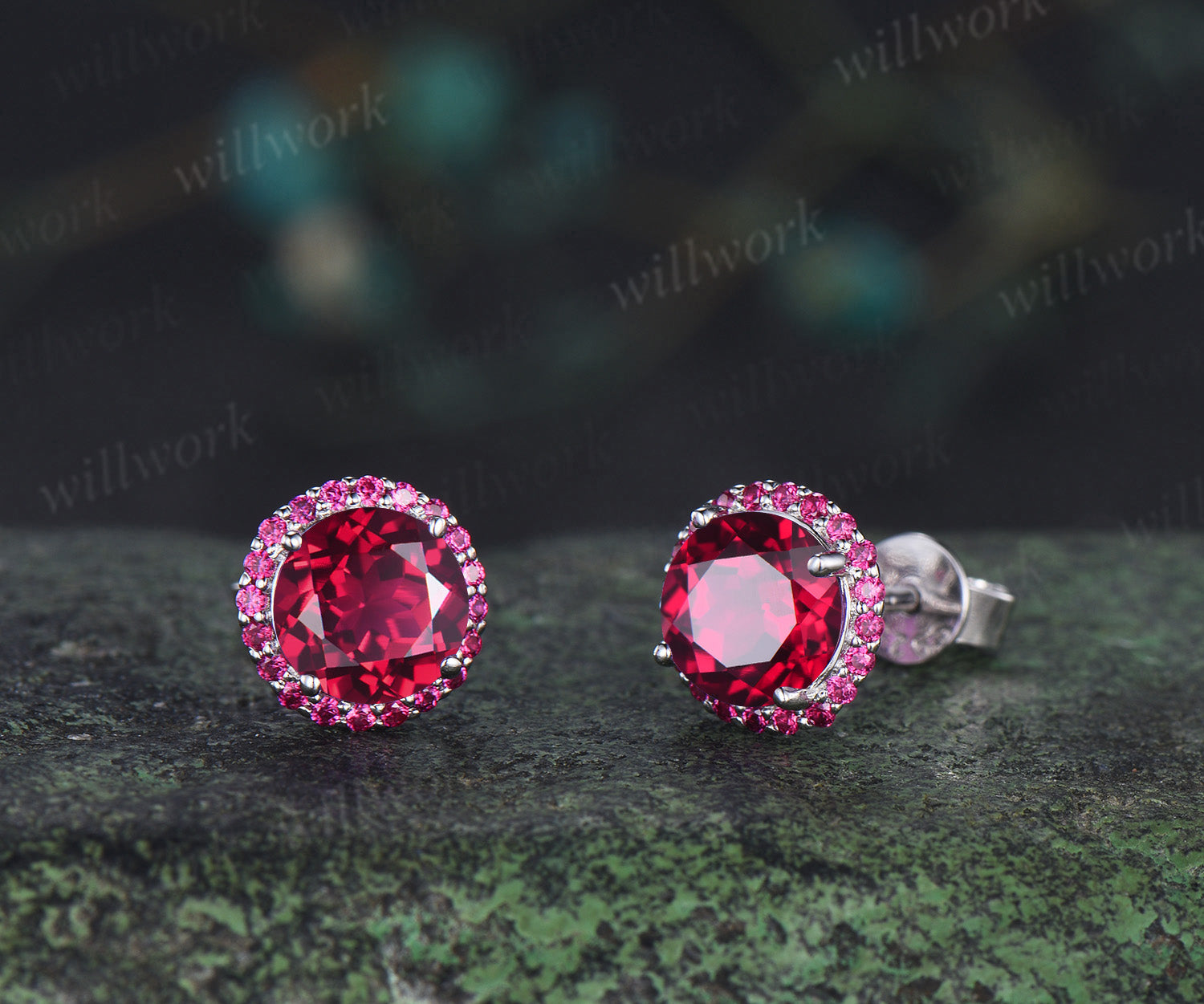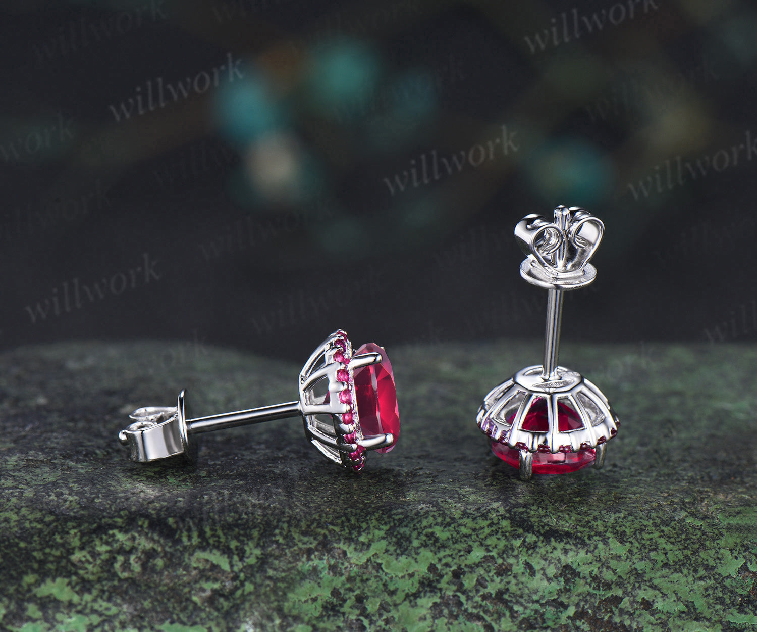 Vintage round ruby stud earrings red ruby halo piercing jewelry July birthstone gifts
