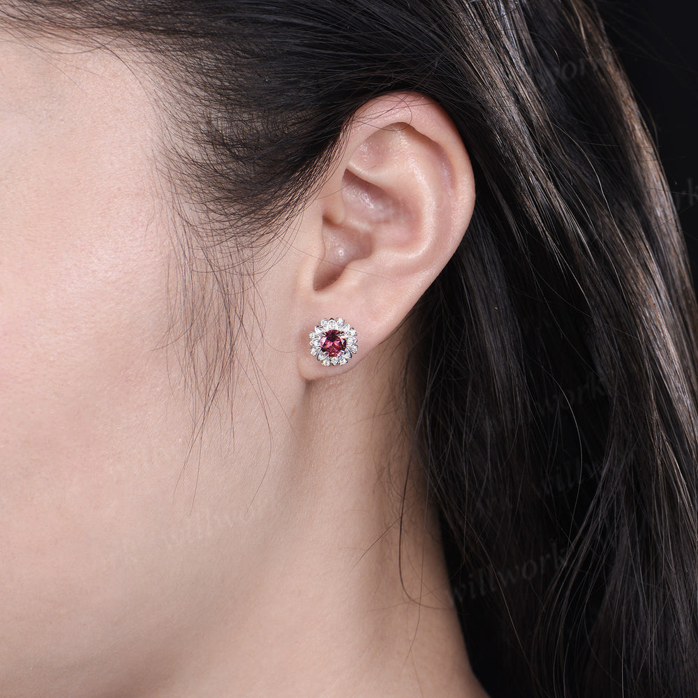 Round cut natural pink tourmaline floral earrings unique moissanite halo stud earrings for women graduation birthday anniversary gift