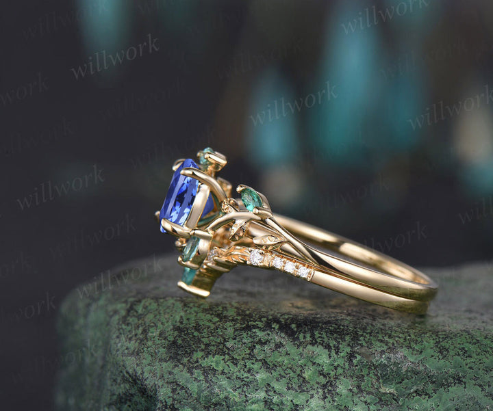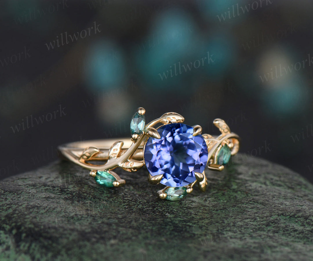 Vintage round cut tanzanite engagement ring solid yellow gold emerald leaf nature inspired moissanite bridal set promise wedding ring