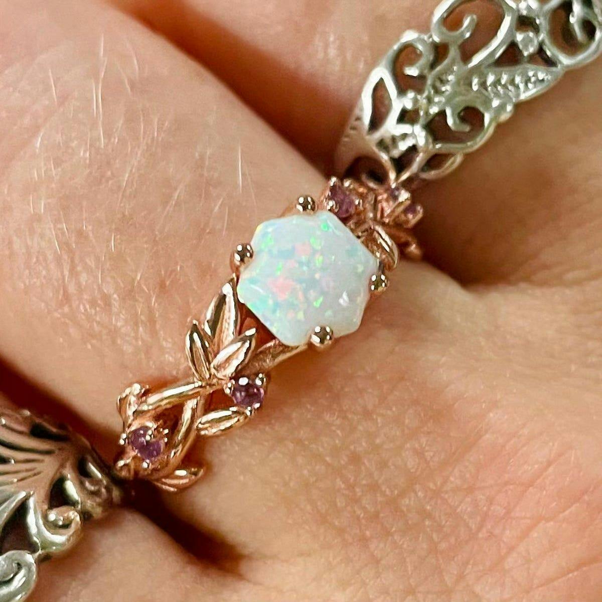 Twig opal ring vintage hexagon cut white opal engagement ring white gold leaf amethyst ring women October birthstone ring anniversary ring
