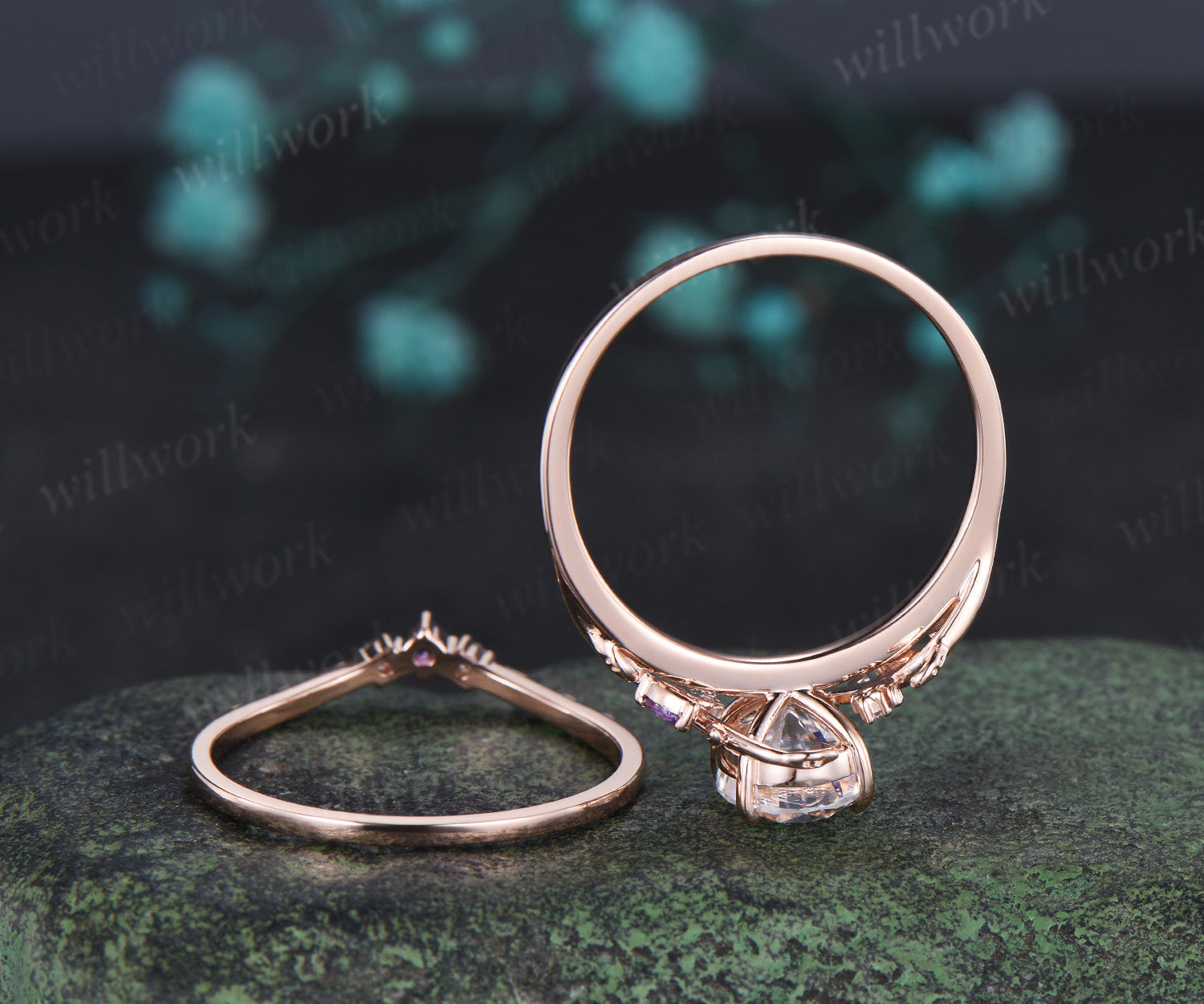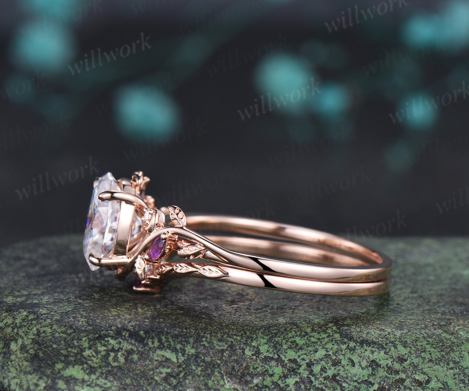 - Wedding Band Stone: natural amethysts and moissanites