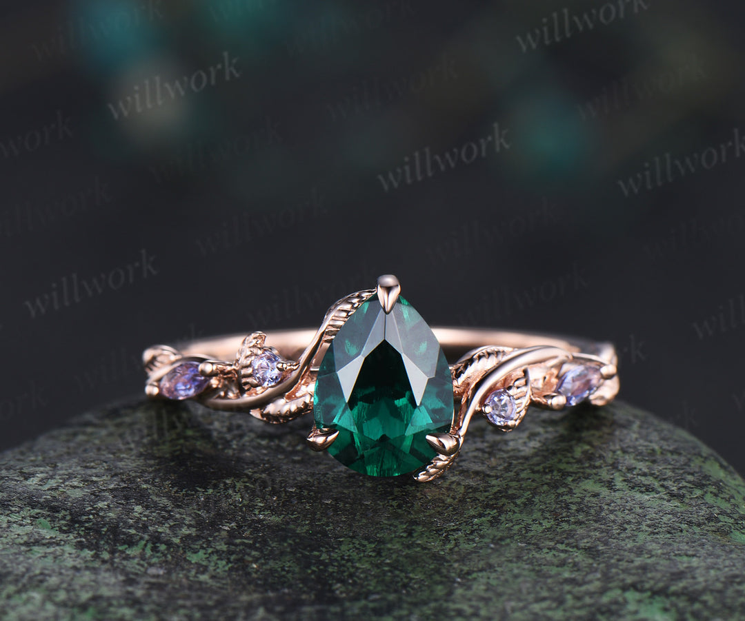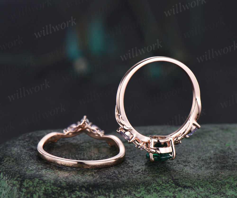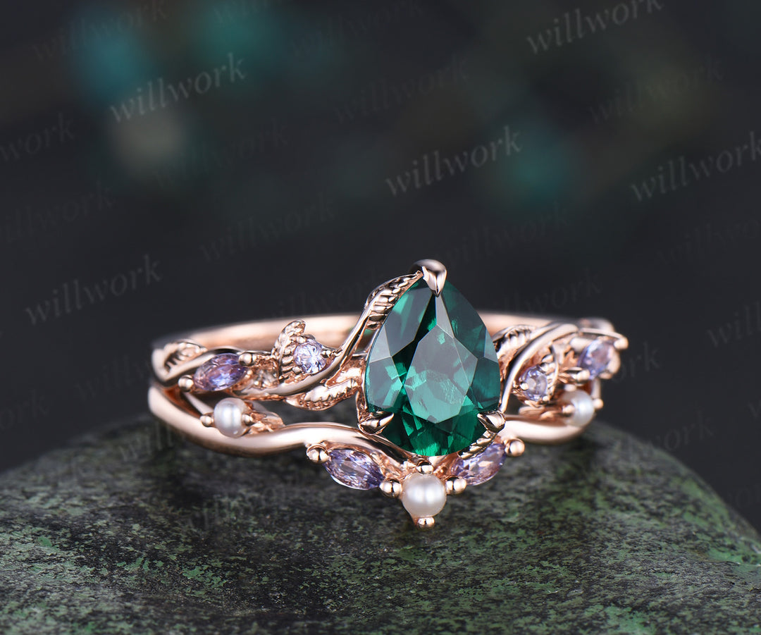 ***A pear cut emerald blooms like spring??¨Ós first leaf in this 14K rose gold bridal set. Twining vines and tanzanite accents evoke enchanted forests, while the curved pearl band adds a soft glow. A romantic, nature inspired engagement ring set made for timeless love and whimsical hearts.***- Metal: Solid gold(10K/14K/18K white/yellow/rose gold),925 sterling silver,platinum available