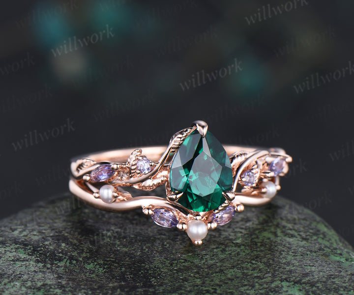 Nature inspired pear cut emerald ring set twig leaf vine tanzanite ring curved pearl band solid 14k rose gold bridal set