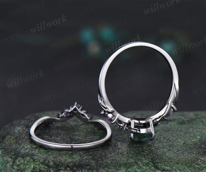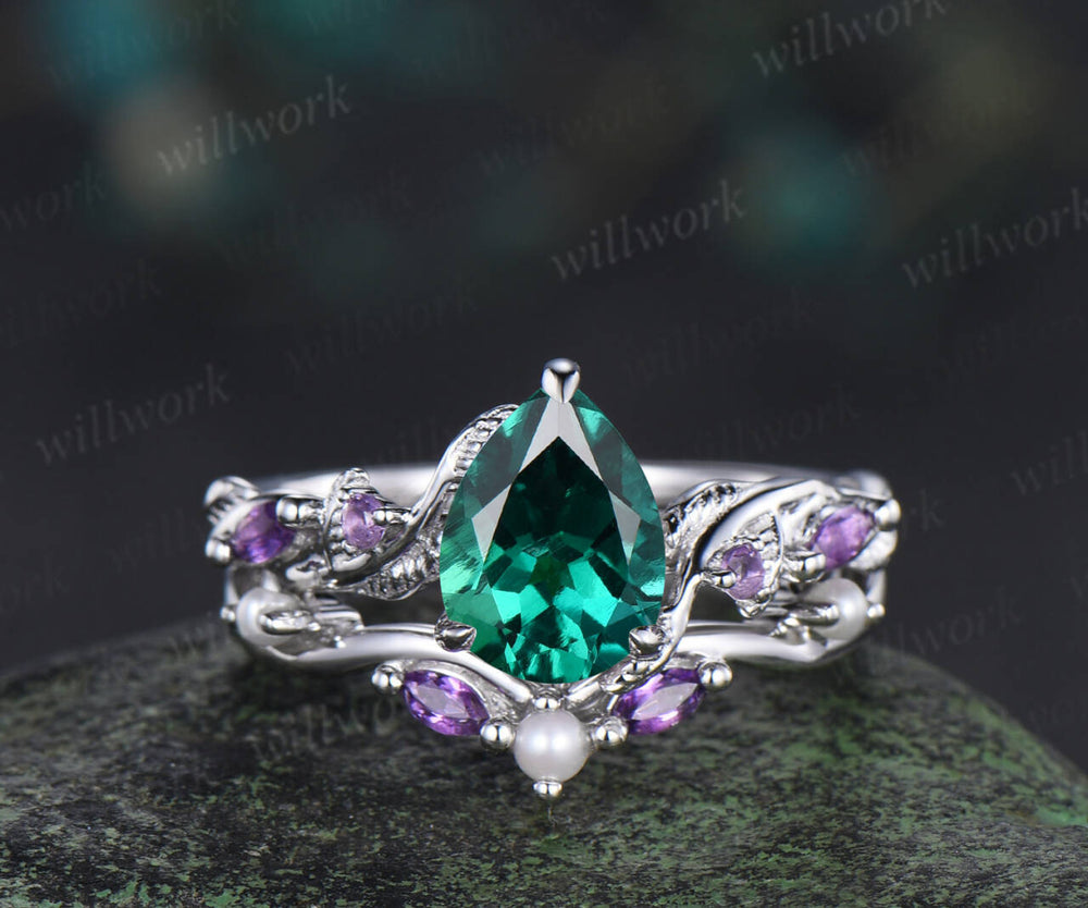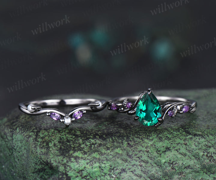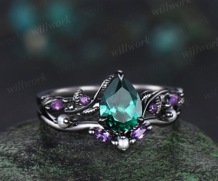 Nature Inspired Pear green emerald pearl Bridal Set 14k black gold Unique Twig Vine Teardrop Engagement Ring Ring Set women