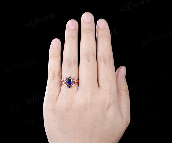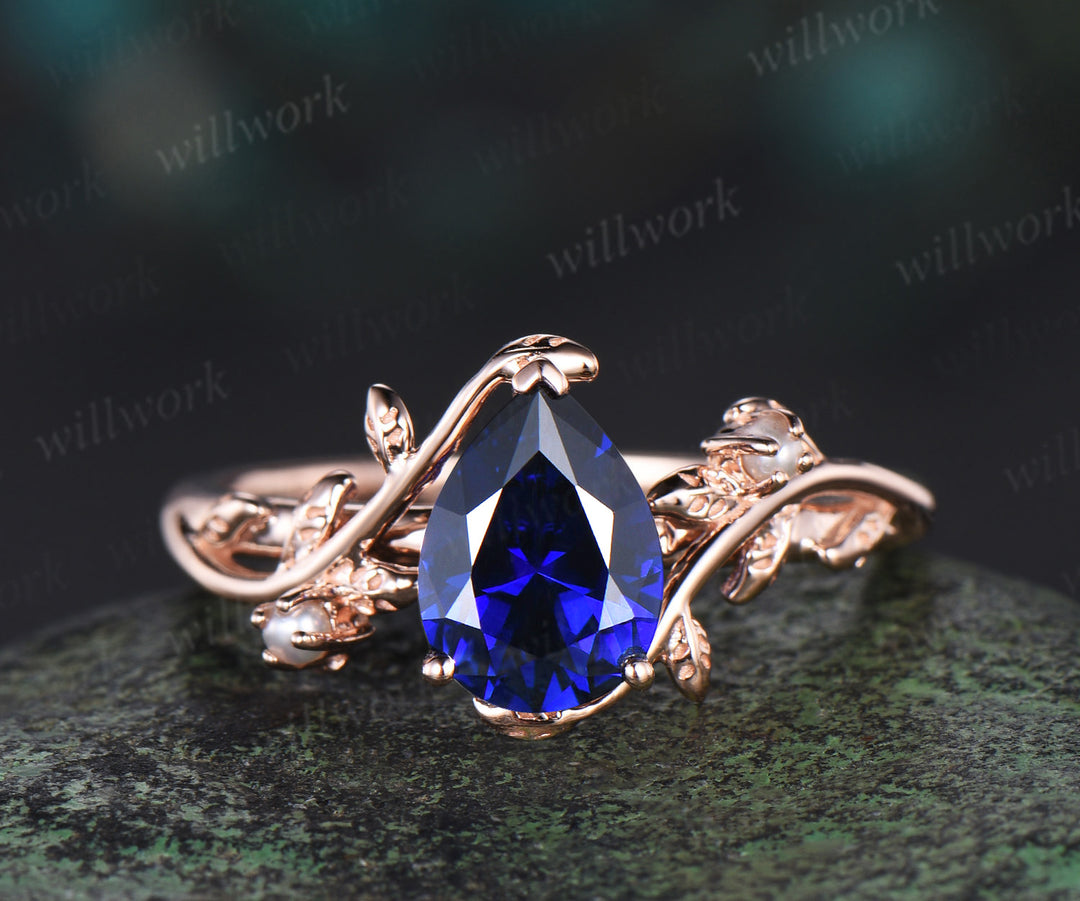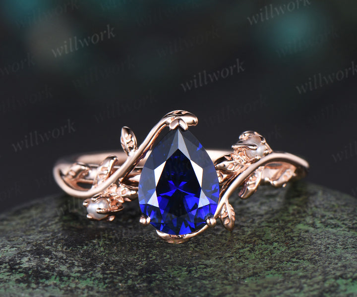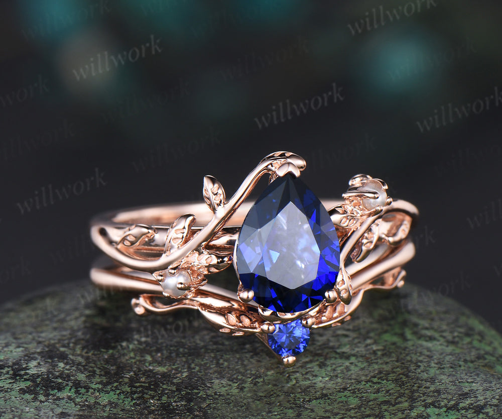 Pear sapphire pearl engagement ring set vintage leaf branch bridal set 14k rose gold unique wedding ring women jewelry