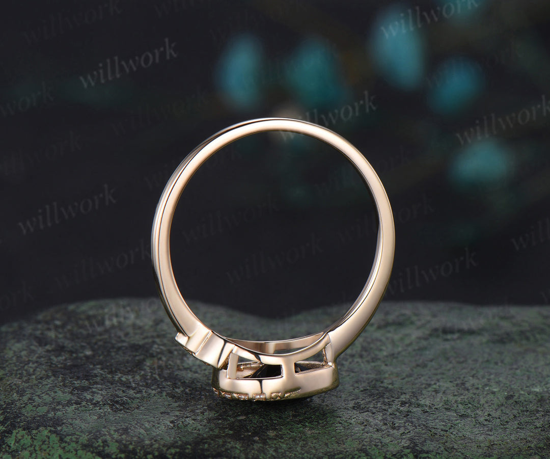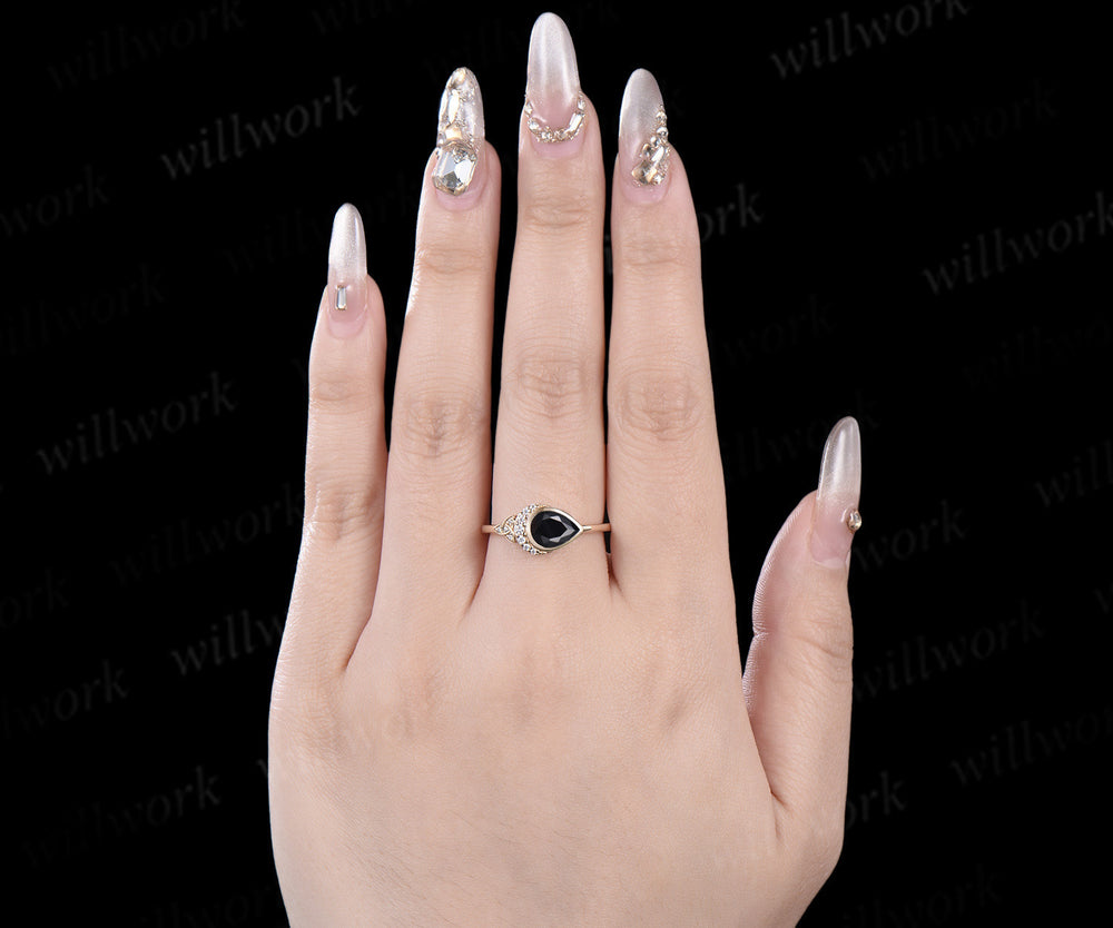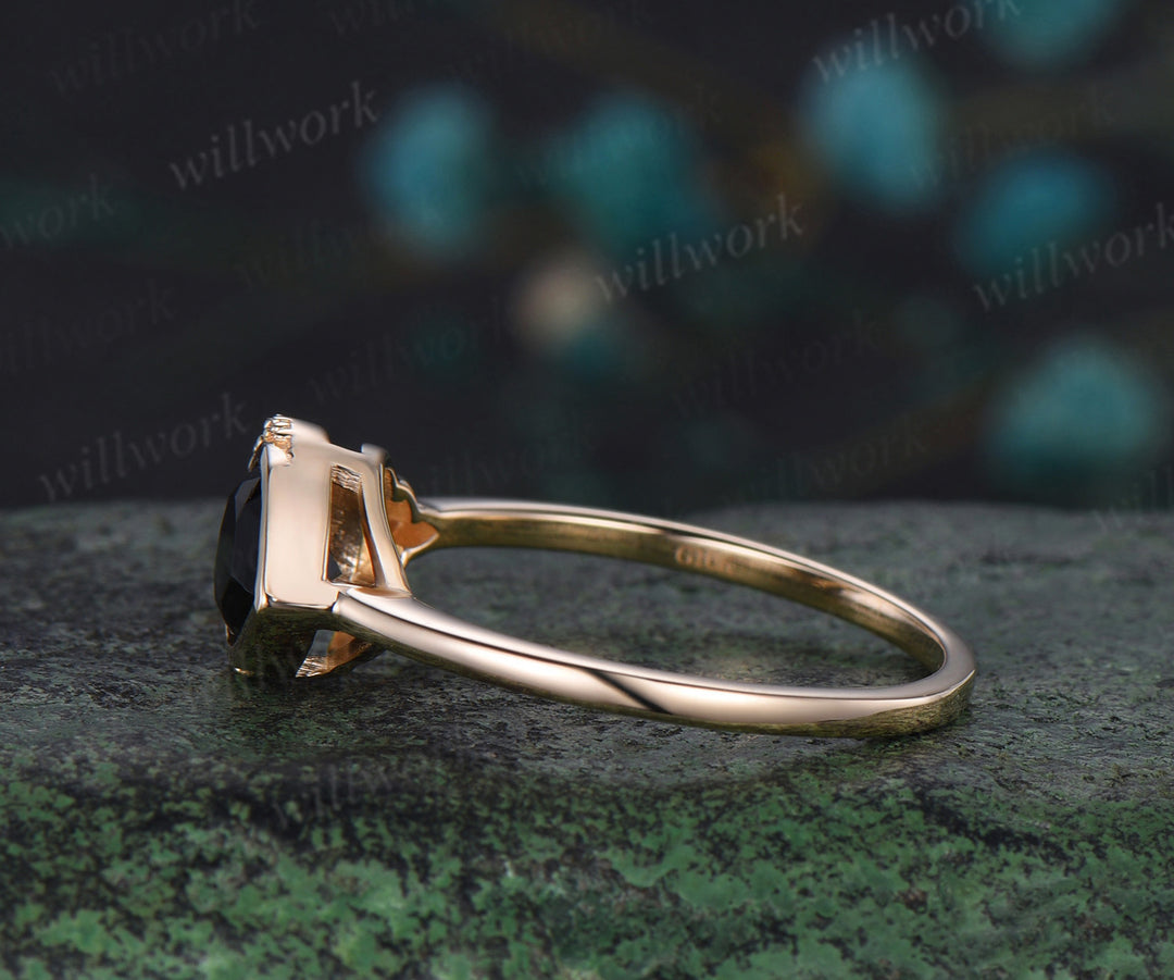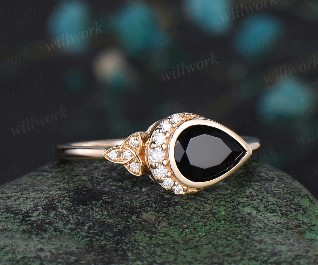 Pear shaped black onyx engagement ring solid 14k yellow gold bezel moon Celtic knot wedding ring women gemstone