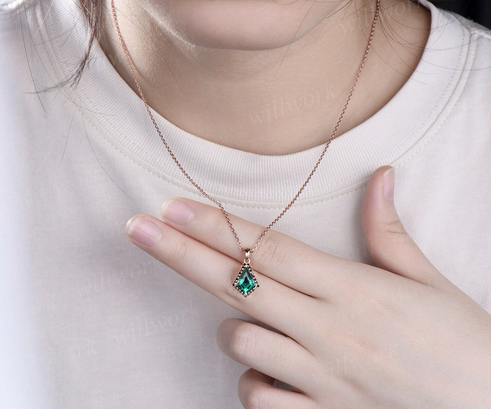 Unique kite cut green emerald necklace solid 14k 18k rose gold halo black diamond pendant for women May birthstone mother anniversary gift