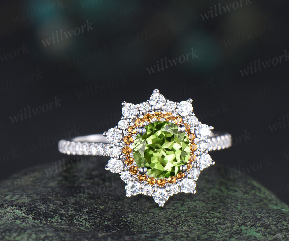 1ct round cut peridot ring double halo citrine unique Engagement Ring 18k white gold wedding ring women