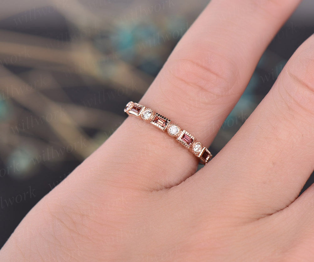 Garnet diamond wedding ring band 14k rose gold garnet ring vintage stacking half eternity matching wedding band princess cut promise ring