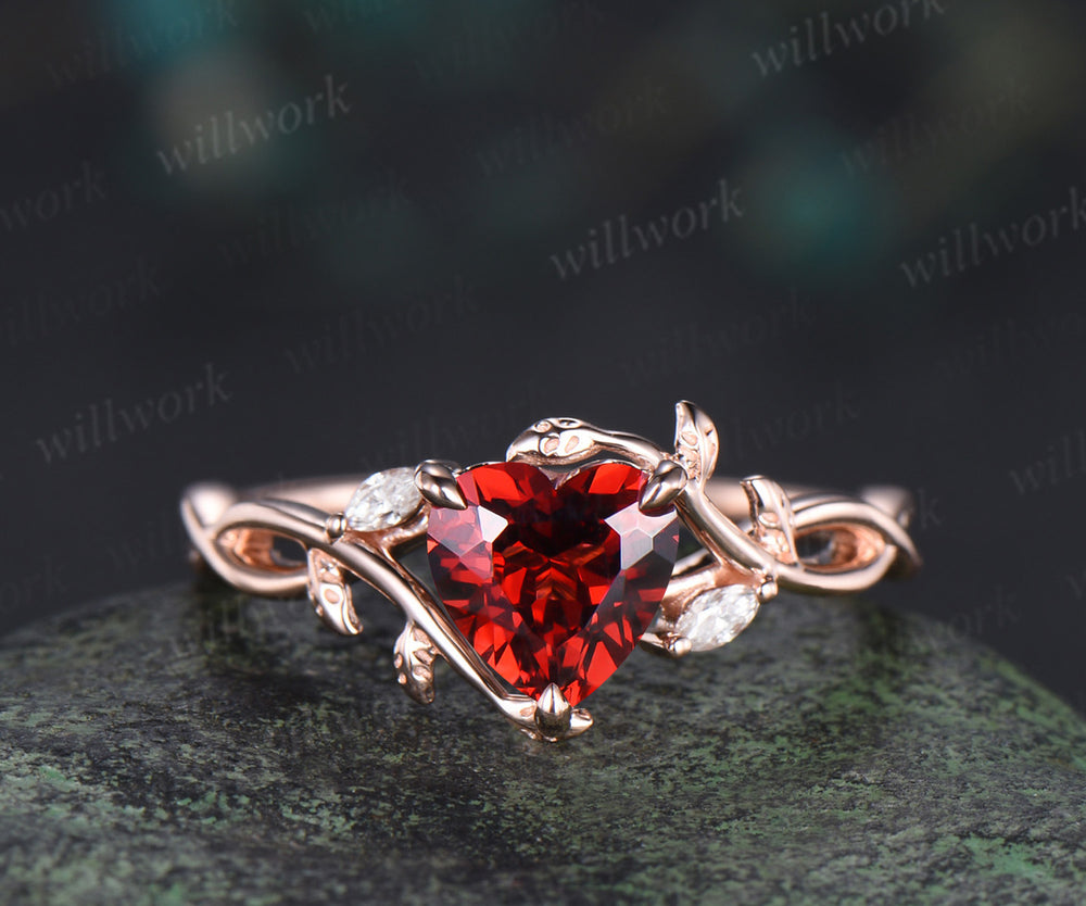 Heart red garnet engagement ring set leaf infinity 14k rose gold nature inspired art deco bridal set jewelry