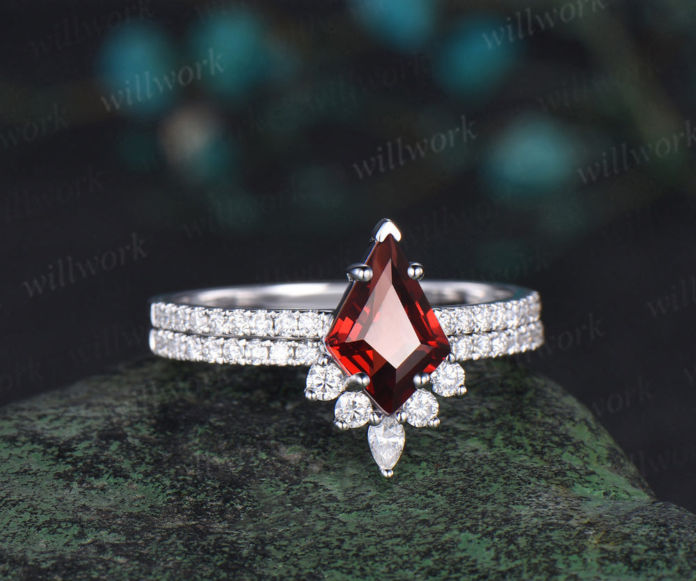 Unique kite cut red garnet engagement ring set women solid 14k white gold half eternity diamond bridal anniversary ring set gift Unique kite cut red garnet engagement ring set women solid 14k white gold half eternity diamond bridal anniversary ring set gift $300.00