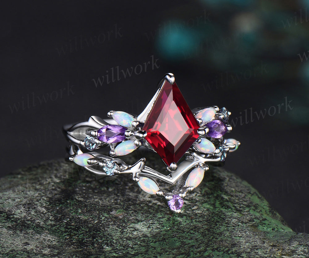 Vintage Kite Red Ruby Engagement Ring Set White Gold Vines alexandrite Amethyst Opal Ring Women Bridal Set Unique Twig Anniversary Promise Ring Gift