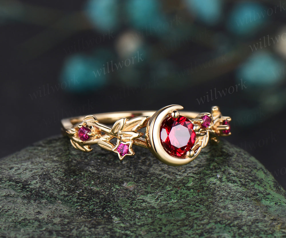 Round cut Ruby Engagement Ring Gothic Black Moon Leaf Design Ring Leaf Branch 14k yellow gold Wedding Ring Witchy Ring July Birthstone Gift