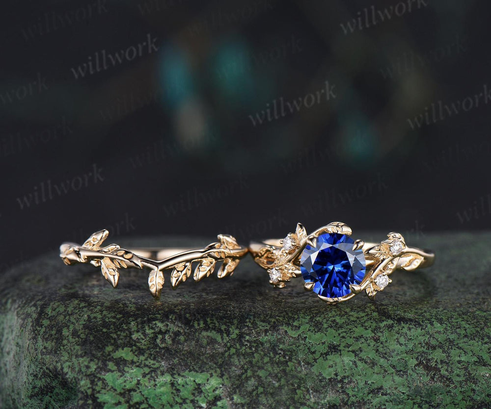 1ct round cut blue sapphire engagement ring set leaf five stone yellow gold ring nature inspired art deco wedding ring set women