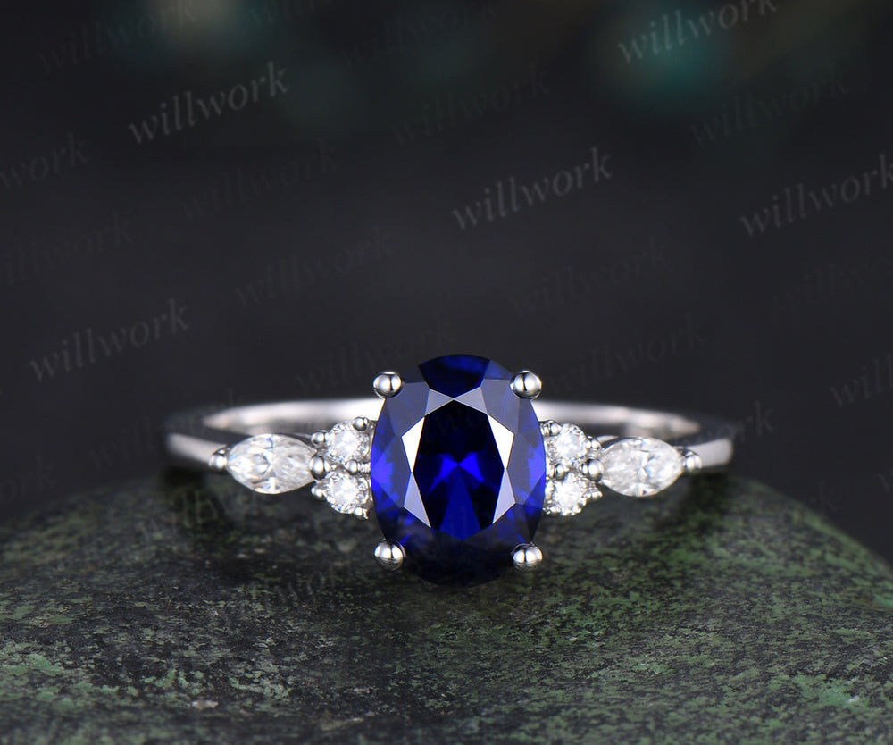 Oval cut blue sapphire engagement ring set seven stone moissanite ring vintage moon women Celtic knot wedding bridal set