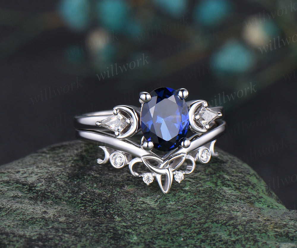Oval cut blue sapphire engagement ring set vintage moon three stone kite moissanite ring women Celtic knot wedding ring set gift