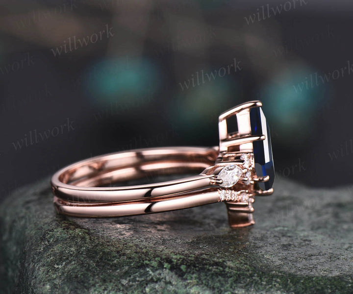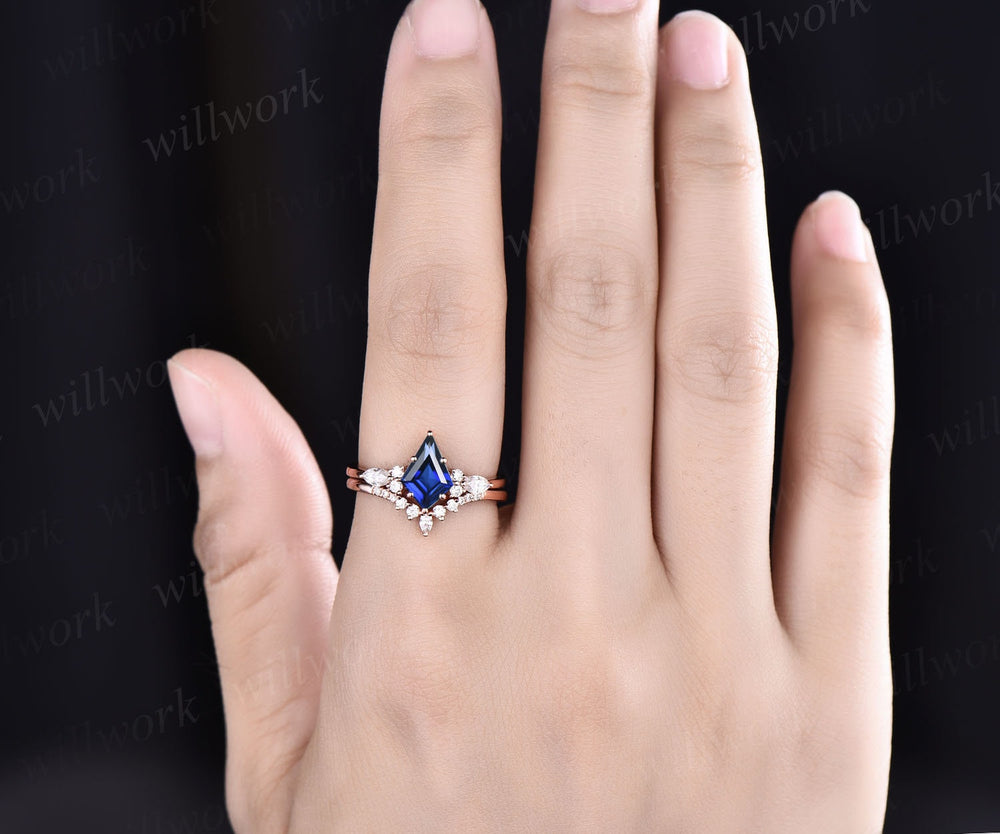 Vintage kite cut blue sapphire ring unique engagement ring set 14k rose gold marquise cut diamond ring women promise bridal wedding ring set