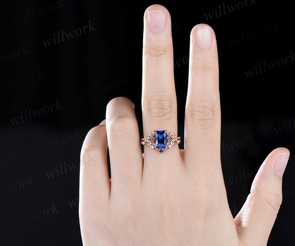 Vintage Radiant cut sapphire engagement ring rose gold leaf flower nature inspired unique cluster diamond bridal wedding ring set women