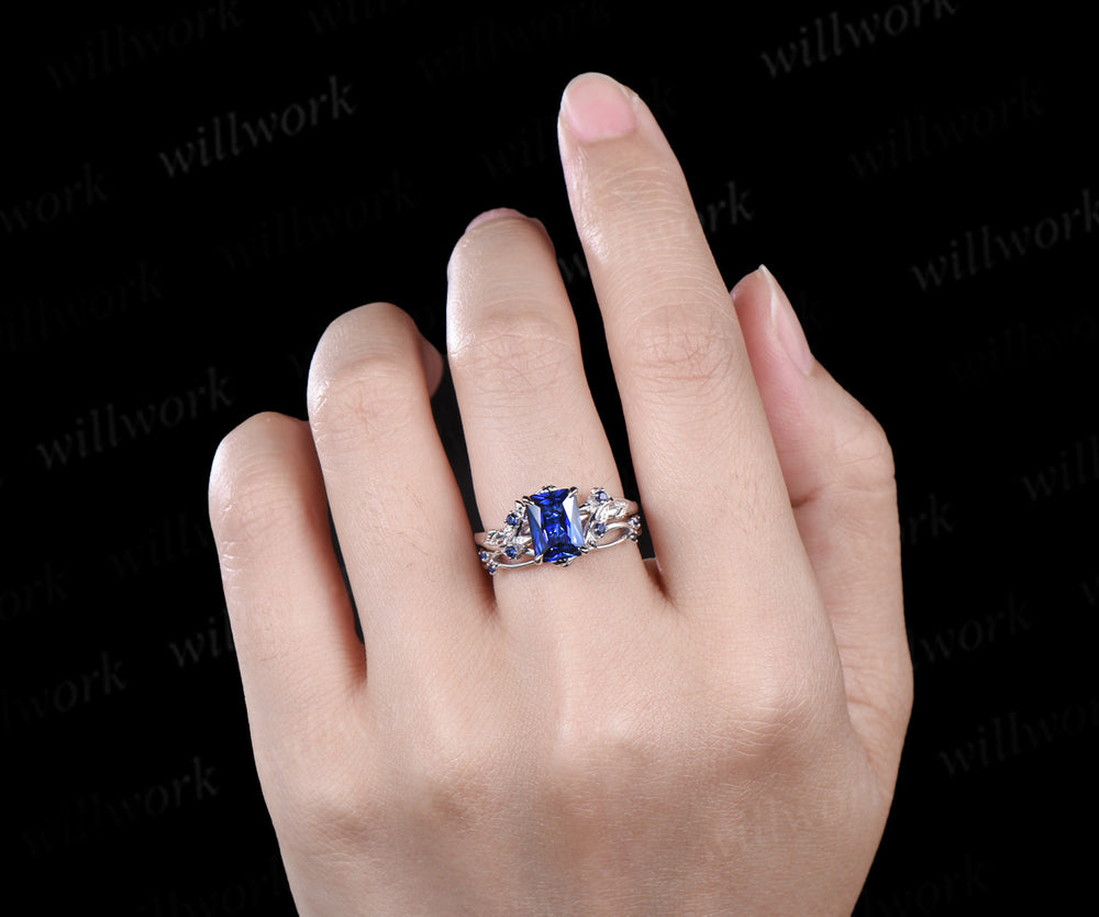 Vintage Radiant cut sapphire engagement ring twig leaf nature inspired sapphire ring art deco matching band unique bridal set