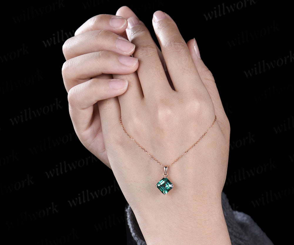 Asscher cut lab green sapphire necklace solid 14k rose gold vintage unique Personalized pendant women her gemstone anniversary bridal gift mother