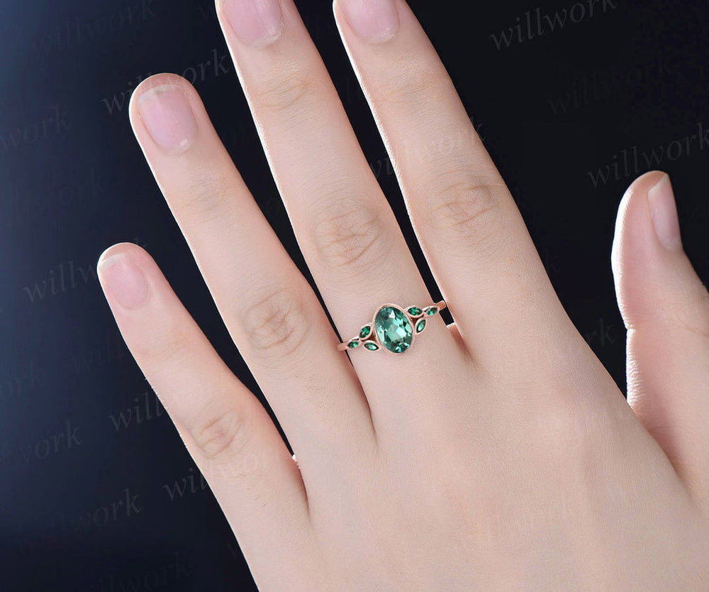 Vintage bezel oval green sapphire engagement ring art deco emerald ring women solid 14k rose gold antique green gemstone ring fine jewelry