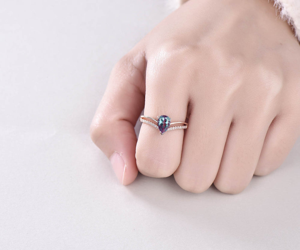 5x7mm Pear Lab treated Alexandrite engagement ring rose gold diamond split shank stacking ring vintage engagement ring June birthstone ring