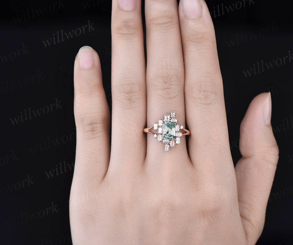 Emerald cut green moss agate engagement ring rose gold unique baguette cut engagement ring split shank moissanite promise wedding ring women