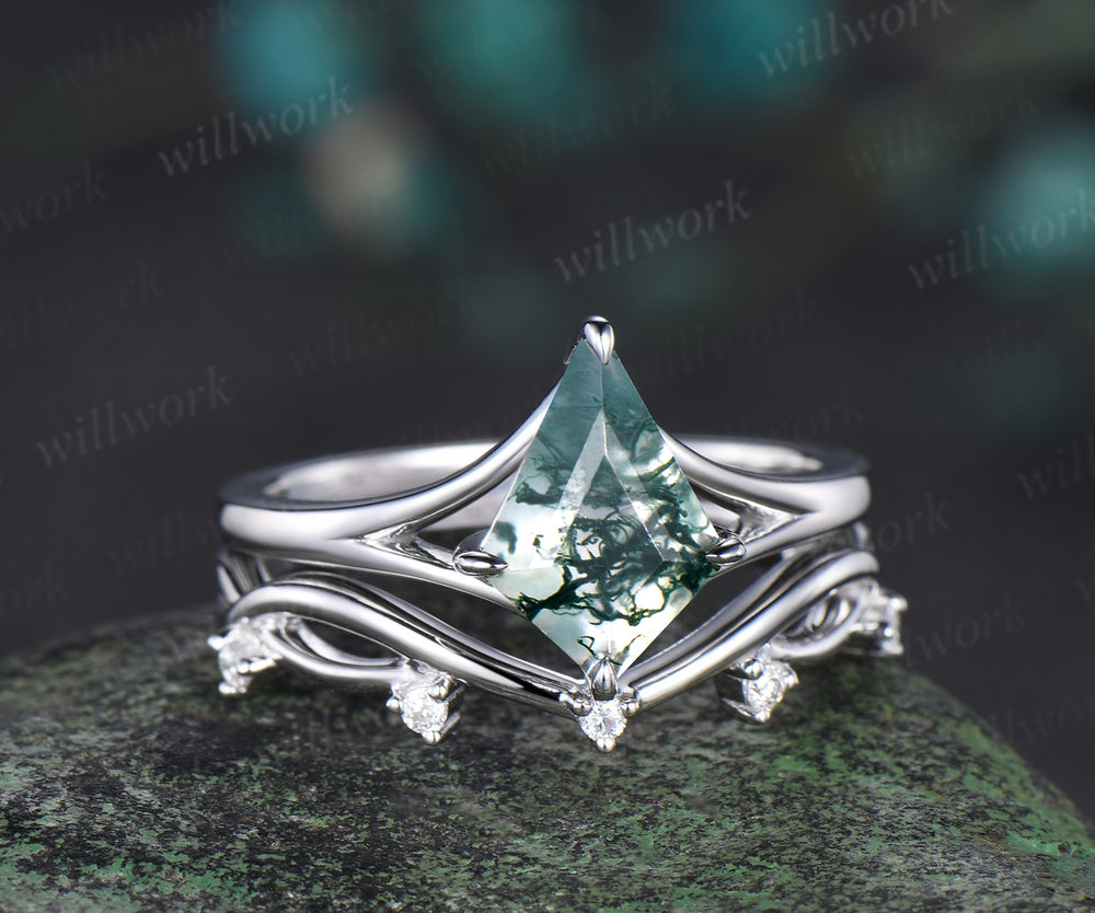 Kite cut moss agate bridal ring set white gold unique split shank engagement ring infinity wedding ring set women