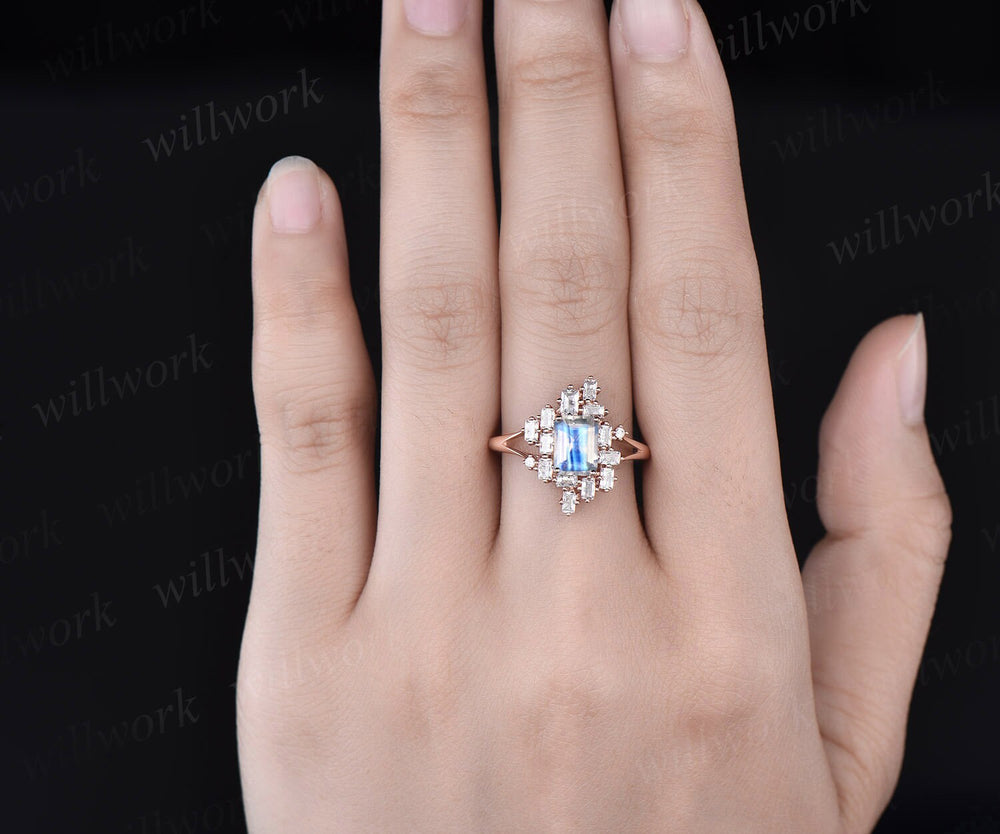 Moonstone ring vintage Emerald cut moonstone engagement ring baguette cut split shank engagement ring rose gold promise wedding ring women