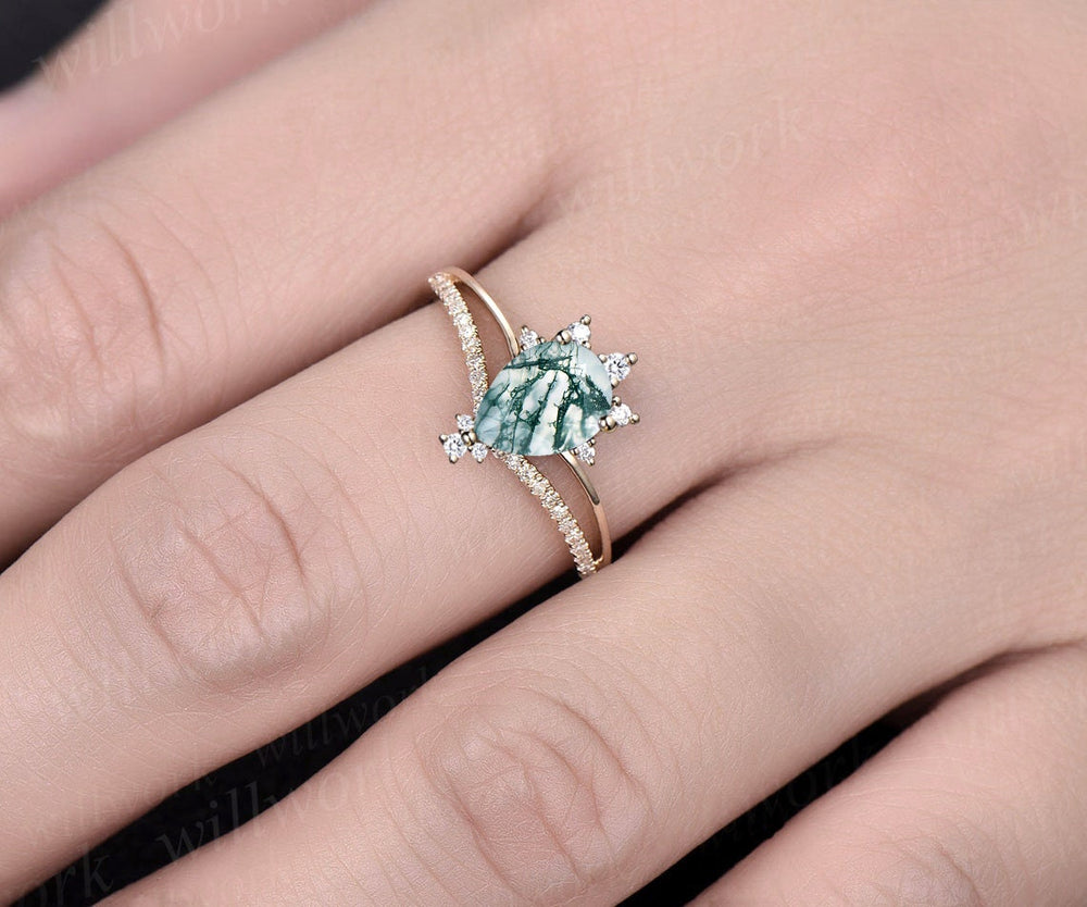 Vintage pear shaped moss agate engagement ring 14k rose gold half eternity cluster split shank diamond ring unique bridal ring women jewelry