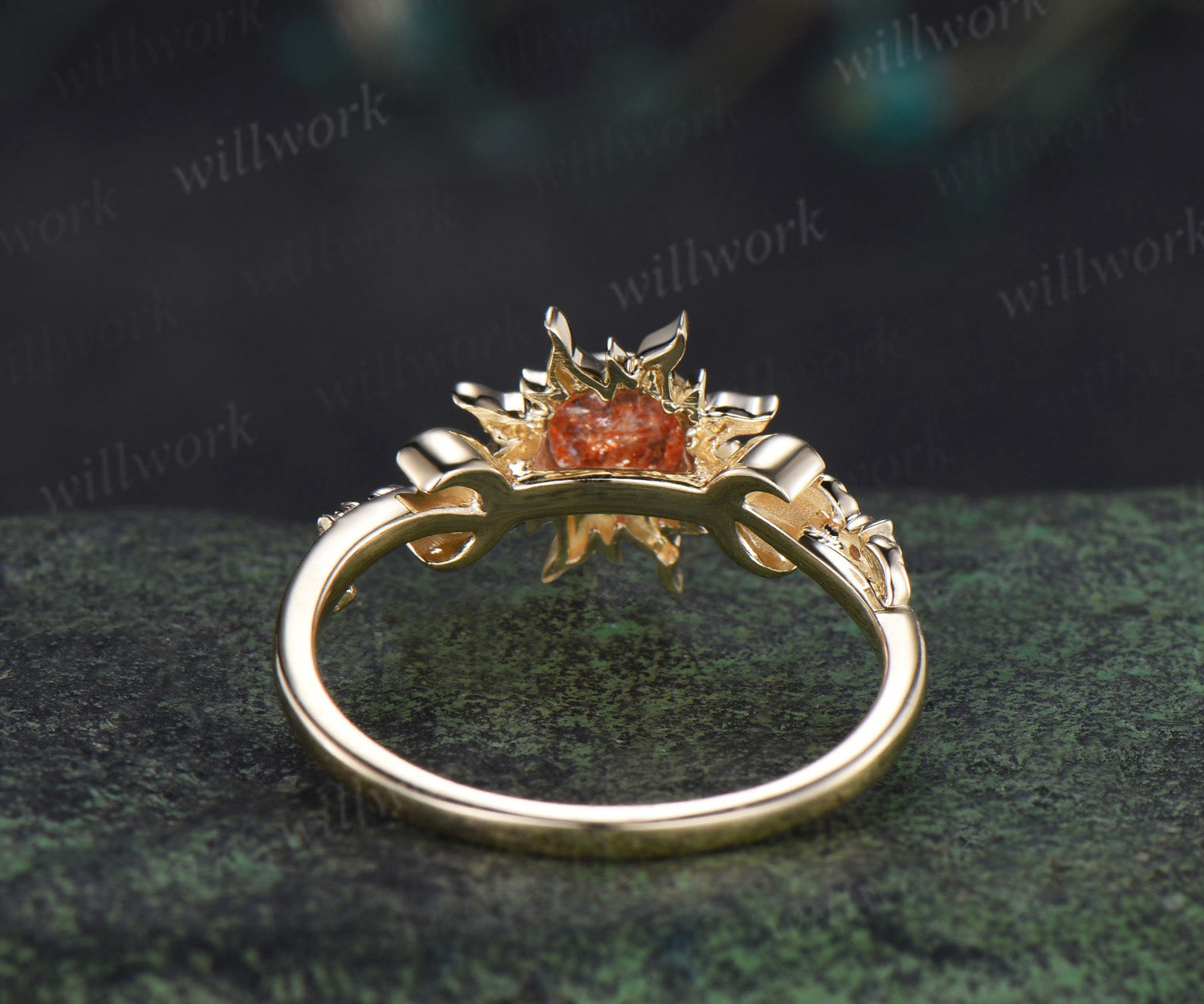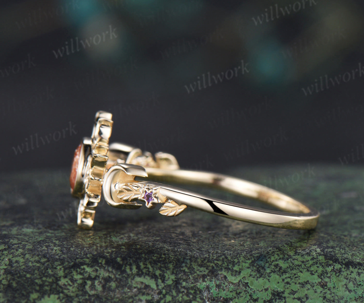Vintage round cut sunstone engagement ring sun bezel promise ring 14k yellow gold moon star amethyst unique leaf bridal ring gifts for her