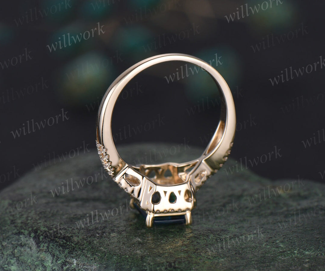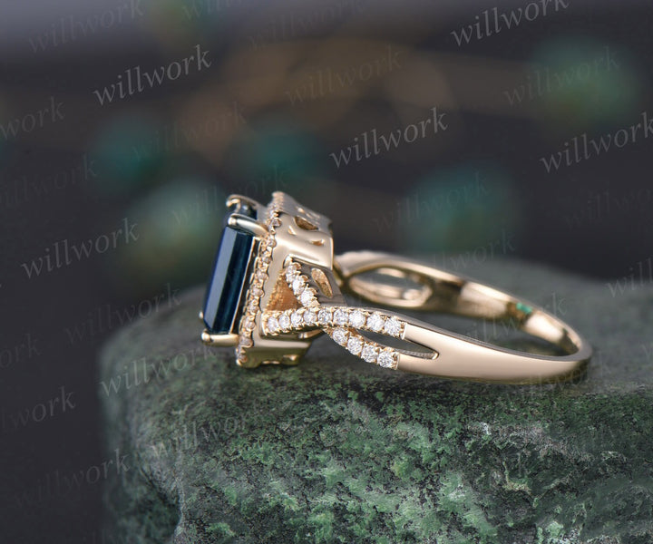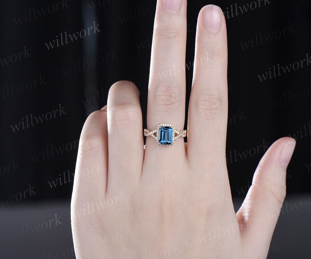 Emerald cut London blue topaz ring vintage infinity halo unique engagement ring twisted diamond ring yellow gold promise wedding ring women