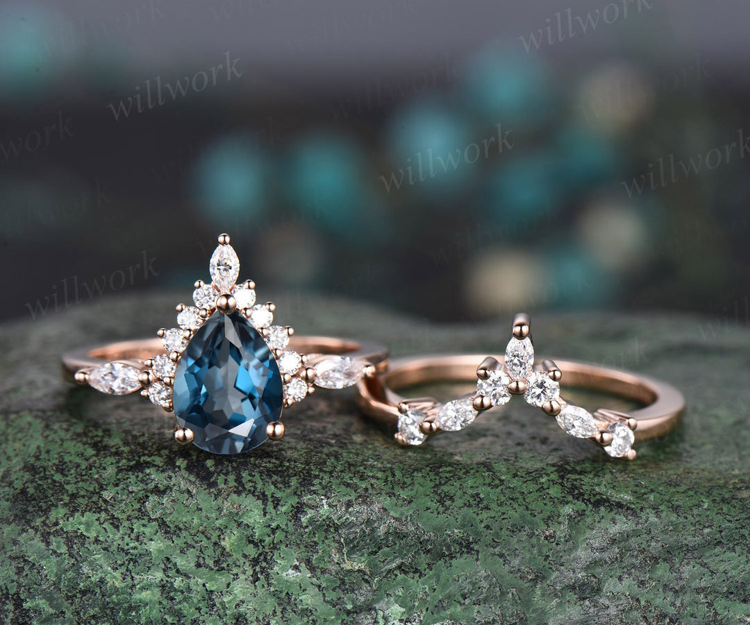 Pear shaped London blue topaz ring halo marquise unique engagement ring women solid 14k rose gold gemstone wedding anniversary ring gift
