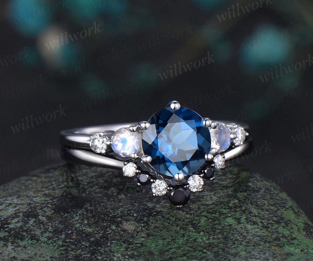 Round cut London blue topaz ring white gold five stone moonstone black spinel moissanite ring women 6 prong unique engagement ring gift Round cut London blue topaz ring white gold five stone moonstone black spinel moissanite ring women 6 prong unique engagement ring gift $275.00
