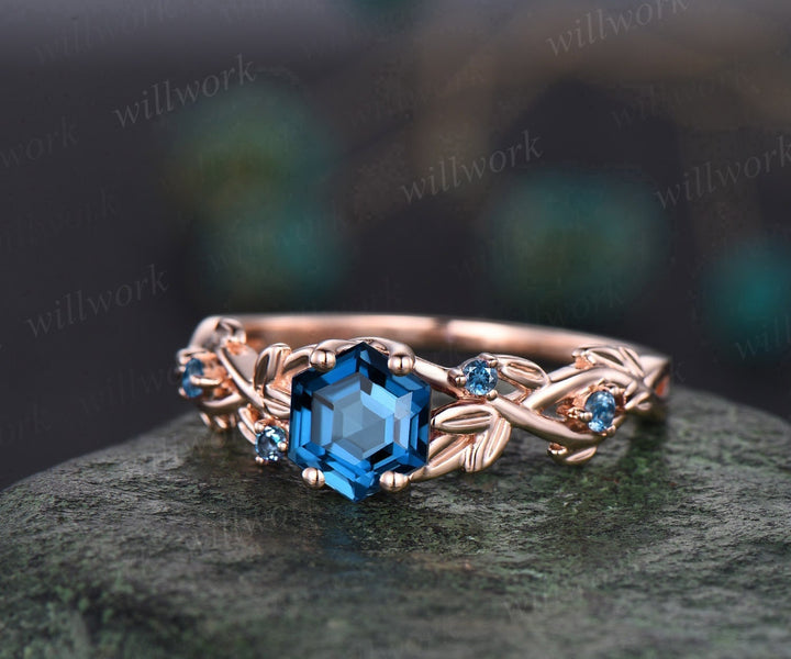 Twig hexagon cut London blue topaz engagement ring 14k rose gold leaf topaz ring December birthstone ring anniversary ring for women gift
