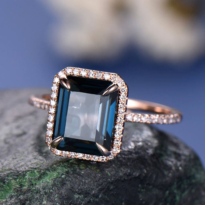 Vintage 8x10mm Emerald Cut London Blue topaz engagement ring topaz ring solid 14k rose gold diamond halo ring bridal wedding set jewelry Vintage 8x10mm Emerald Cut London Blue topaz engagement ring topaz ring solid 14k rose gold diamond halo ring bridal wedding set jewelry $1,352.00