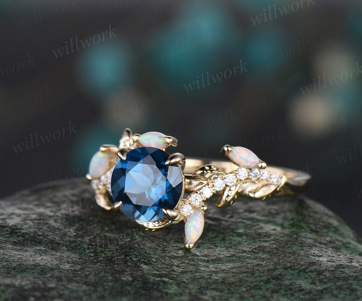 Vintage round London blue topaz engagement ring yellow gold leaf nature inspired branch half eternity diamond opal anniversary ring women